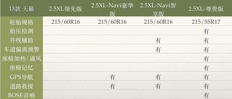 13款天籁有四个配置:2.5XL领先版、2.5XL-Navi豪华版、2.5XL-Navi智享版、2.5XL-尊贵版
