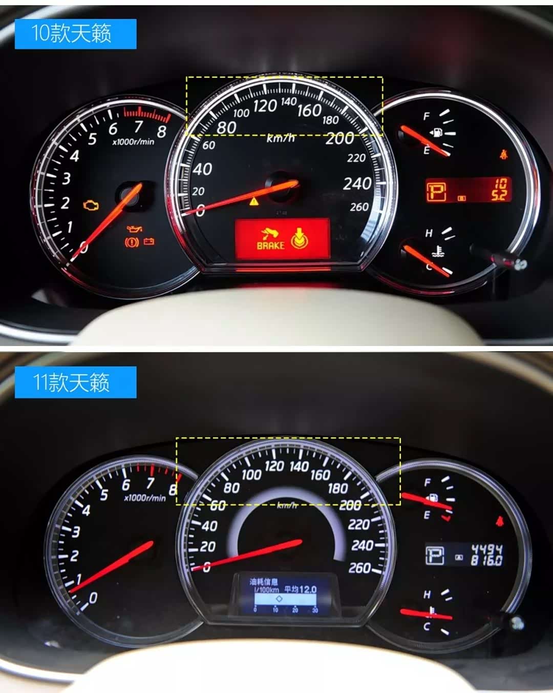10款和11款天籁主要区别:尾灯白色灯罩面积大小、速度表数字大小
