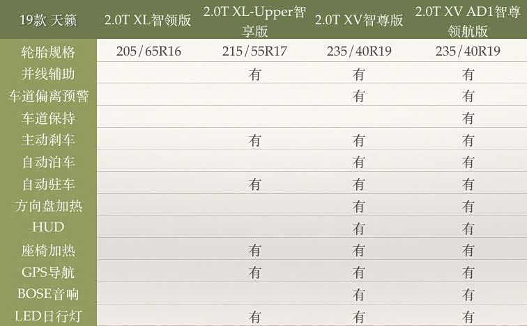 19款天籁有四个配置:2.0T XL智领版、2.0T XL-Upper智享版、2.0T XV智尊版、2.0T XV AD1智尊领航版