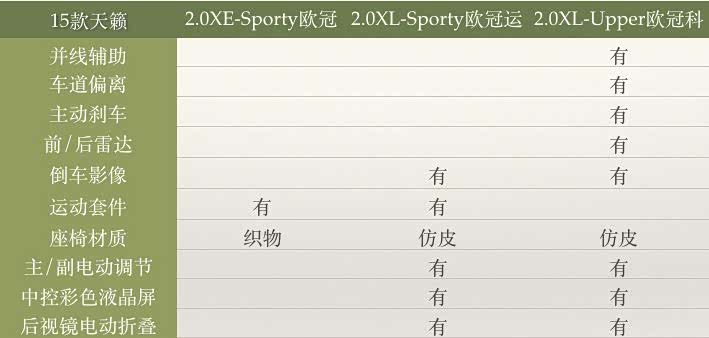 15款天籁有两个配置:2.0XE-Sporty欧冠运动版、2.0XL-Sporty欧冠运动版、2.0XL-Upper欧冠科技版