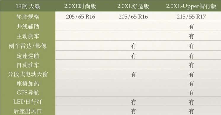 19款天籁有三个配置:2.0XE时尚版、2.0XL舒适版、2.0XL-Upper智行版