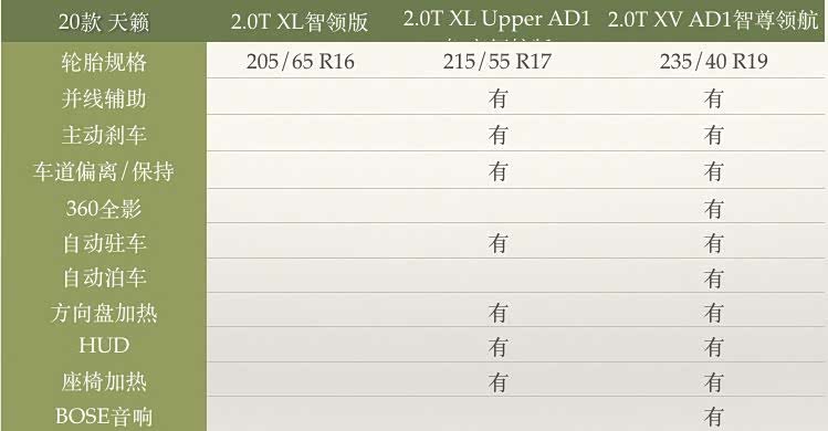 20款天籁有三个配置:2.0T XL智领版、2.0T XL Upper AD1智享领航版、2.0T XV AD1智尊领航版