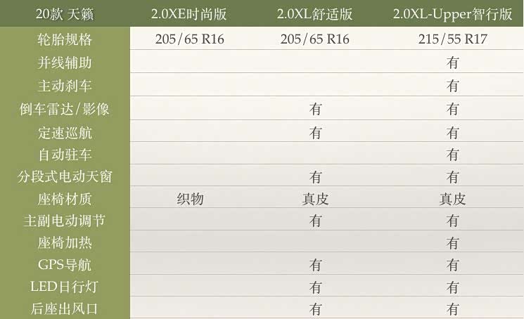 20款天籁有三个配置:2.0XE时尚版、2.0XL舒适版、2.0XL-Upper智行版