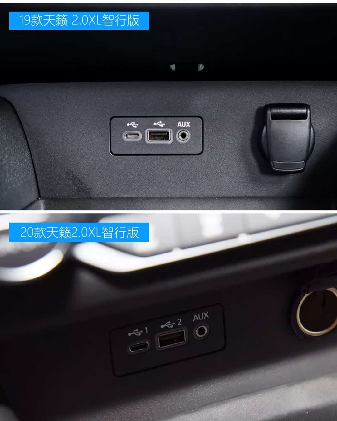 19款和20款天籁2.0L智行版/2.0T智尊领航版主要区别:USB插口标识