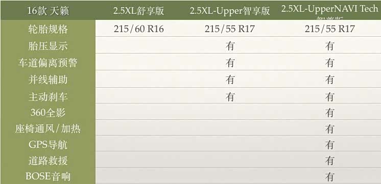 16款天籁有三个配置:2.5XL舒享版、2.5XL-Upper智享版、2.5XL-UpperNAVI Tech智尊版