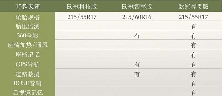 15款天籁有三个配置:2.5XL-Upper欧冠科技版、2.5XL-Navi Tech欧冠智享版、2.5XL-Upper NAVI Tech欧冠尊贵版