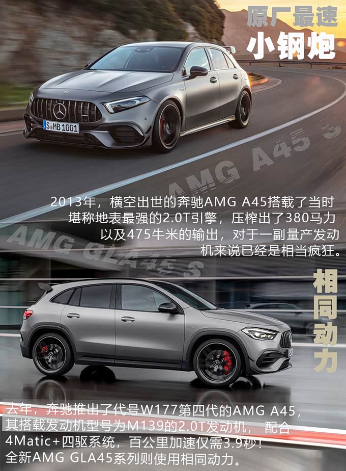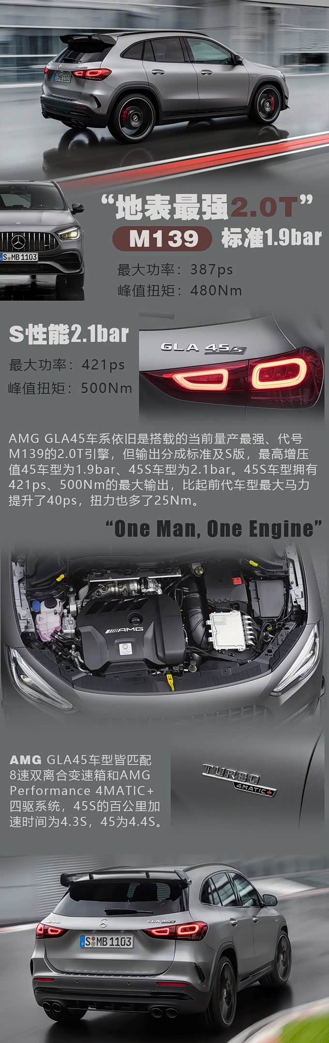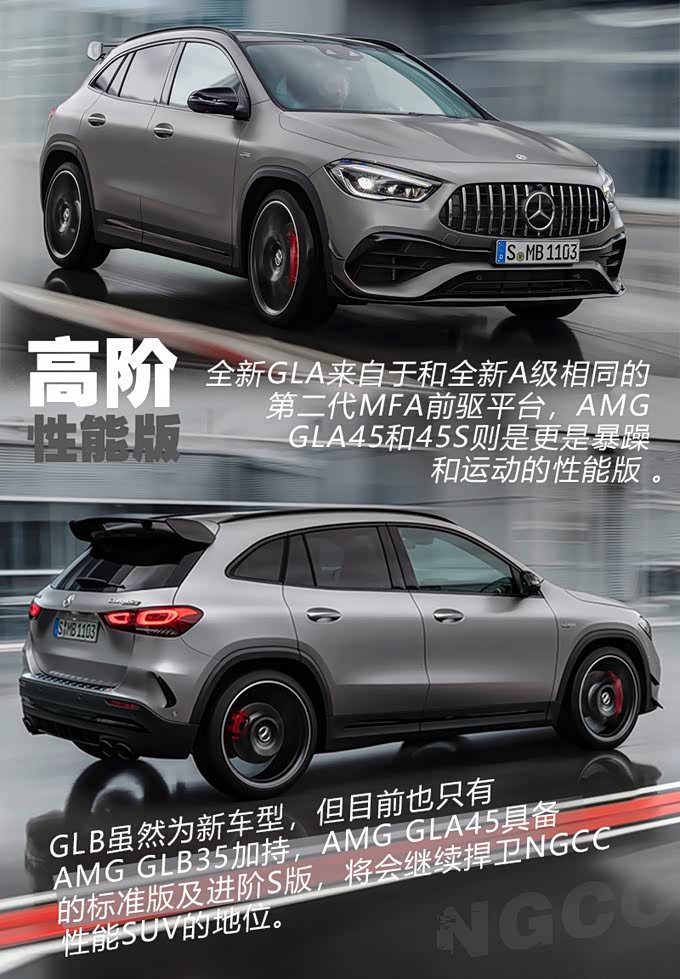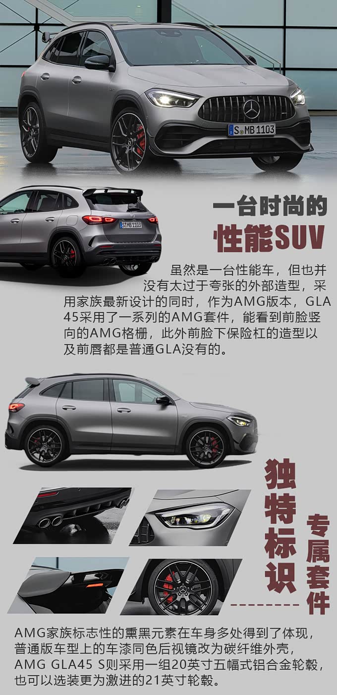 作为奔驰SUV系列的入门产品,GLA凭借着运动时尚的外形一直深受年轻消费者喜欢。去年12月份,奔驰发布了全新一代的GLA,与之而来的还有全新AMG GLA35车型。对于很多性能爱好者来说,AMG GLA35虽然在动力方面有了很明显的提升,但这台AMG不能入群的玩笑,使得心中多少有点芥蒂和别扭。时隔几个月后,为了满足挑剔的消费者,奔驰带来了全新一代的AMG GLA45/45 S,这台更纯粹的AMG小钢炮似乎才是大多数性能爱好者心中想要的。