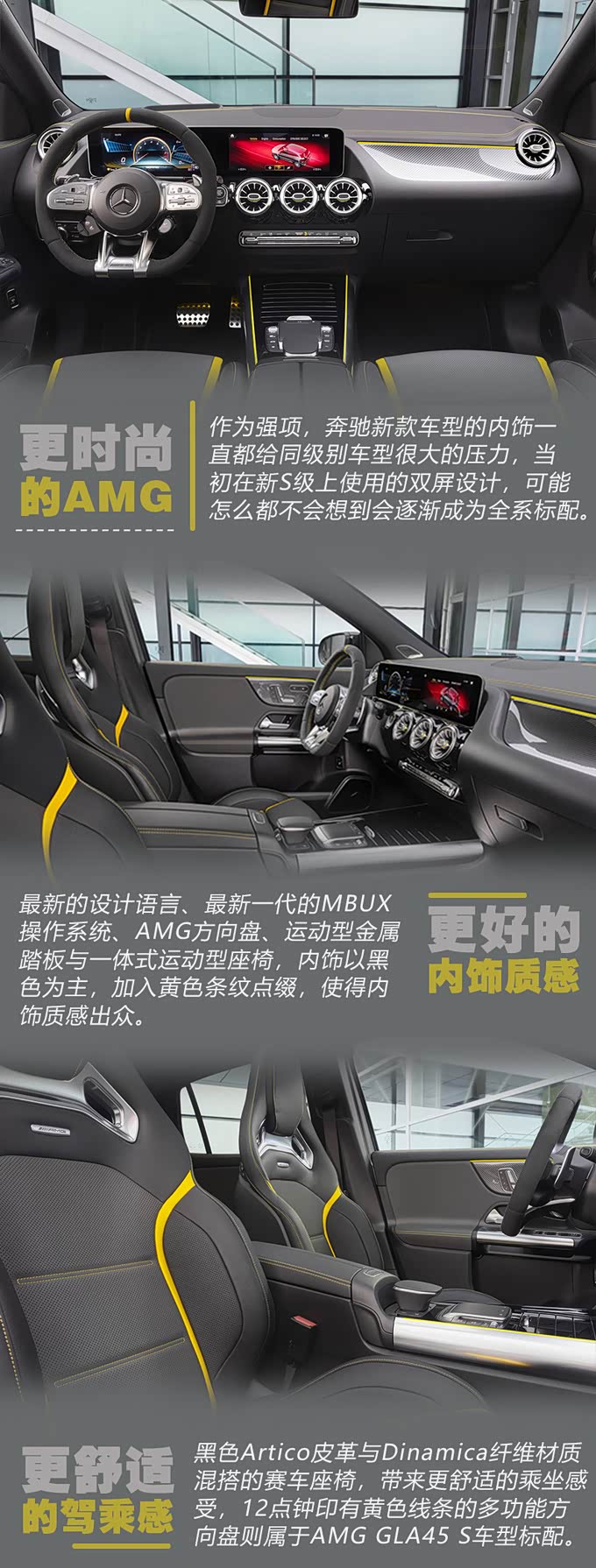 作为强项的内饰部分,当然会在最为重要的AMG车系上得到完整体现,基于最新的家族样式设计,细节上凸显高性能标识,AMG赛车座椅、AMG多功能方向盘,AMG铭牌标识,年轻人喜欢的元素一次性给足。科技配置上也没有落伍,车联网、双联屏液晶仪表、最新的多媒体操作系统应有尽有;空间上,作为全新GLA的衍生车型,AMG GLA 45/45 S的尺寸应该会和全新GLA保持一致,新车的轴距提升至2729mm(现款为2699mm),车身高度提升至1611mm(现款为1535mm),伴随着整车尺寸的增加,车内驾乘空间应该也会有相应提升。