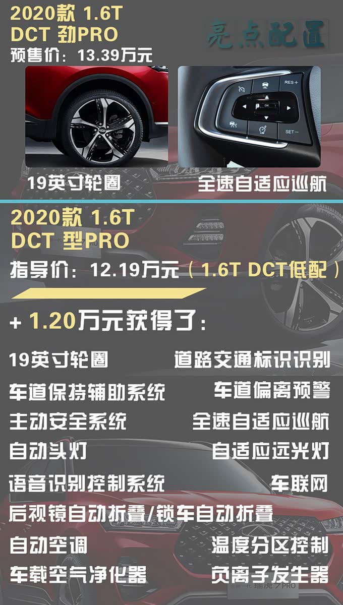 瑞虎7 PRO全系共三款车型,车型笔者推荐的是1.6T DCT 劲PRO车型,属于中配车型,预售价为13.39万元,相比低配车型贵出1.20万元,而低配车型的配置与上面我们所推荐的1.5T CVT豪华型一致。至于多花的这1.20万元,你可以获得现阶段较为主流的配置,比如车道偏离预警、车道保持辅助系统、道路交通标识识别、主动安全系统、全速自适应巡航等,这对于一款家庭用车来说可以算作是加分项的配置,最为直接的体现便是让你的驾驶变得更为轻松,尤其是长途驾驶时。在舒适性配置上,同样有所提升,可提供自动空调、车载空气净化器、负离子发生器,后两项配置对于现阶段或是空气质量不佳的地区来说,绝对称得上是刚需配置。同时,在动力方面也有很大的提升,1.6T+7DCT不论是操控还是动力响应速度都要优于CVT车型。如果预算充裕或是对于动力有更高的要求,1.6T DCT 劲PRO是个不错的选择。