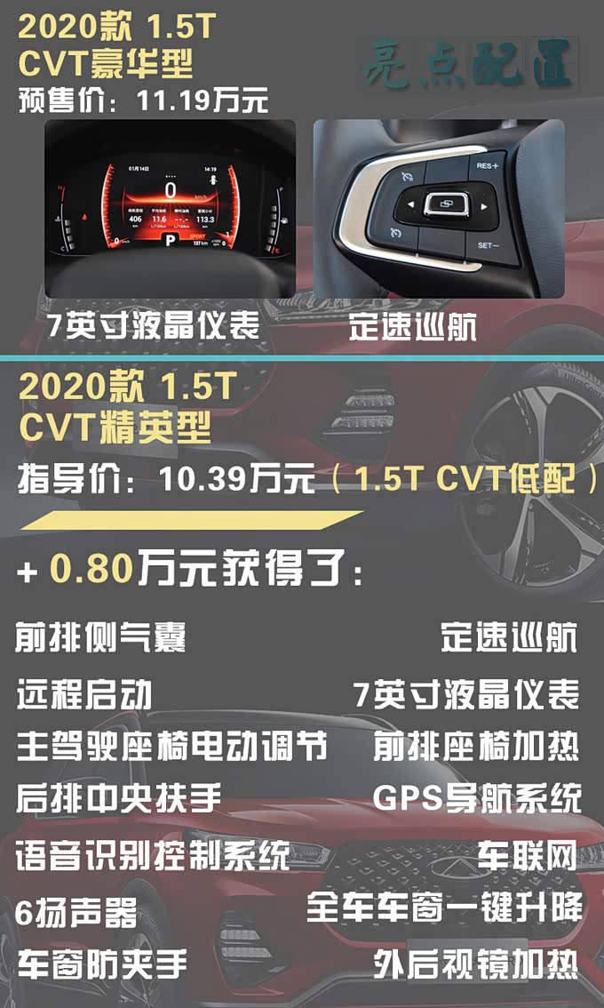 对新车有了大致的了解后,我们步入正题,本期内容主要针对网友选购瑞虎7作为家庭用车进行推荐,既然如此笔者就在1.5T的瑞虎7中和1.6T的瑞虎7 PRO中各推荐一款。相比以往不同,我们这次先将推荐车型告诉各位,1.5T CVT豪华型和1.6T DCT劲 PRO,至于为何推荐这两款,咱们往下看便会得到答案。