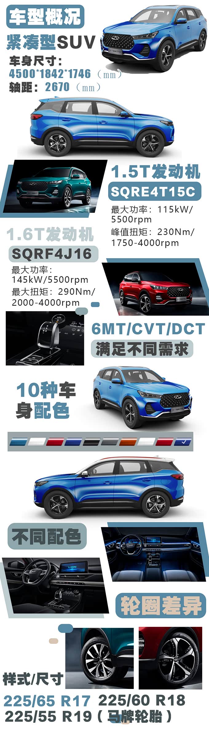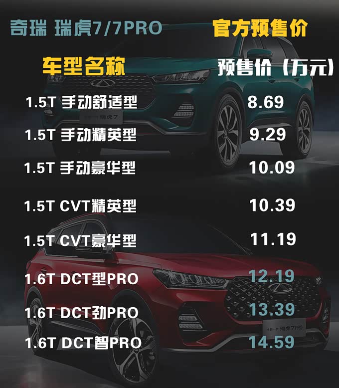 中国汽车市场最不缺的车型就是紧凑型SUV,不论自主品牌还是合资品牌近年来都如同下饺子般推出新车,而对于已有车型更是加快更新换代速率,目的只有一个,让自己的产品更吸引消费者,获取更好的市场份额。而这其中哈弗H6就是一个很好的例子,销量不必多说,其系列车型也是不胜枚举。好的形式自然会被复刻,即将上市的全新一代 瑞虎7/瑞虎7 PRO也是如此,作为瑞虎7的换代车型,新车将推出搭载1.5T+CVT/6MT动力的全新瑞虎7和搭载1.6T+7DCT动力的全新瑞虎7 PRO,根据配置不同提供8款车型,预售价区间为8.69-14.59万元。而在我们的后台,也收到了很多网友的留言,对于新车有购买意向,用途为家庭用车。那么如何选择呢,今天就给你答案。
