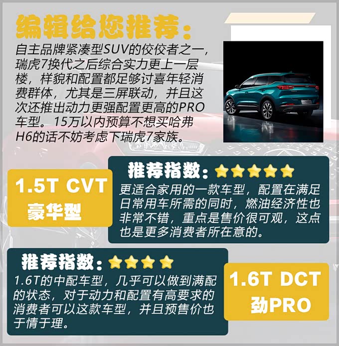 总结:十万元出头可以选择的自主品牌SUV车型并不在少数,不过现阶段自主品牌在三大件方面仍是参差不齐,如此一来,选择一个更技术更为成熟的品牌才是最为省心之选。在这其中奇瑞就算一个,而即将上市的瑞虎7/瑞虎7 PRO车型,也更能代表奇瑞的最新技术。至于为何推荐文中的两款车型,相信各位在看过其配置后便会明白,它们都可以最大限度满足家庭用车所需,且价格合理。若预算实在有限且不介意手动挡的消费者,还可以选择1.5T 手动豪华型车型,除变速箱外与1.5T CVT豪华型完全一致,也是一个不错的选择。