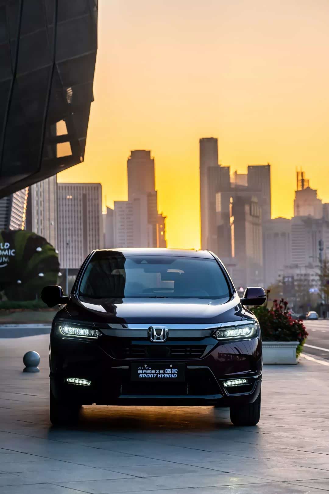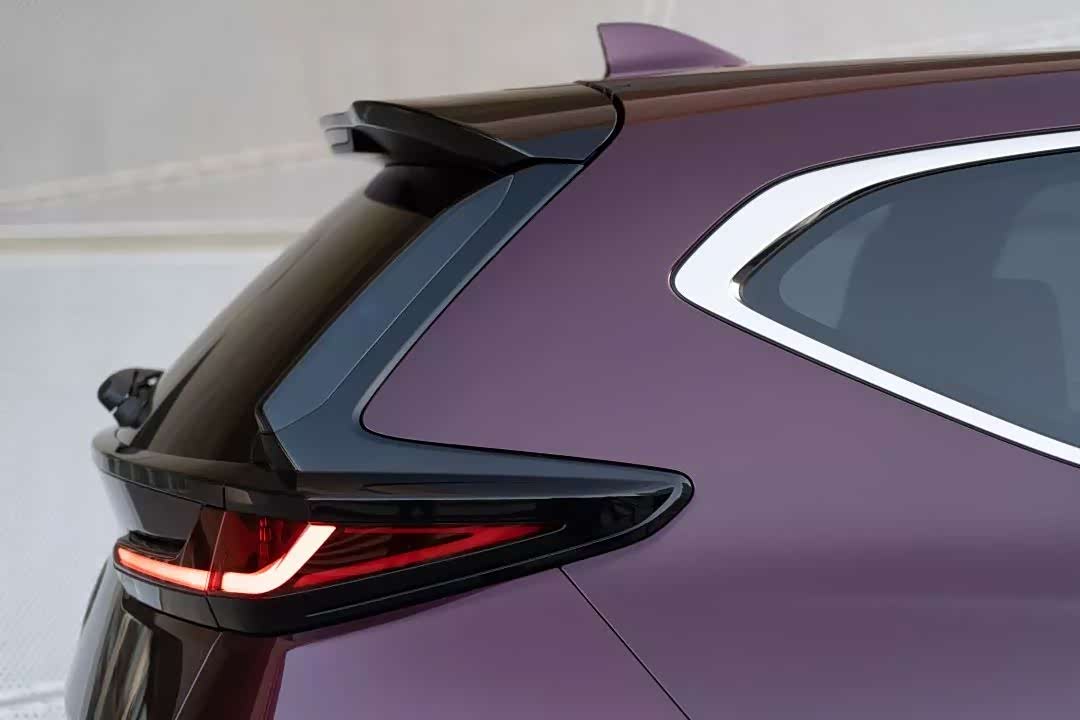 前脸部分皓影的设计非常有意思,老司机不想用太多冠冕堂皇的词语来形容它。很简单我们把它剖析一下,可以由上而下分为三层。第一层是它中网上方的镀铬饰条与两侧的矩阵式LED大灯贯通连接,并将本田标毫无违和感的镶嵌在其中,前置摄像头则隐藏在本田标下。因为SUV的车身相比于轿车来说都会比较高,这一个设计手法瞬间从视觉效果上把这台车拉宽了,比例感会更好,不会有重心高车身窄的感觉。第二层是以下方的主动式进气格栅和毫米波雷达构成,这块区域主要作用是给发动机提供所需的进气量,以及一定的散热效果。第三层则是保险杠的主体,两侧的LED雾灯则可以实现转向照明辅助的作用,既美观又使用,提高了夜晚在小区内转弯时的安全性。牌照框下倒梯形的进气格栅,在能够为散热器提供足够撞风量的同时又为皓影增添了一分气场。
