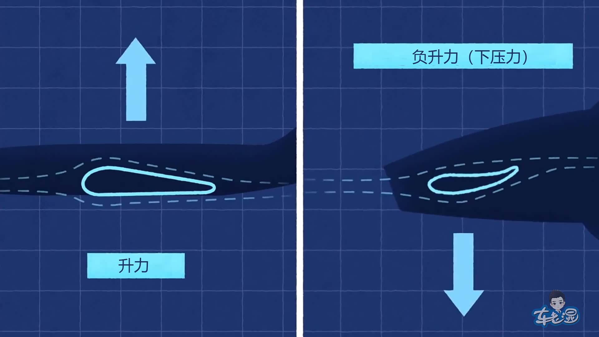 前翼和尾翼中起主要作用的部分是翼片,其产生下压力的原理和飞机翅膀产生升力的原理完全相同,我们可以简单理解为赛车上的翼片就是倒置过来的飞机机翼。根据伯努利定理,流速越大的地方压强越小。赛车翼片的下表面面积大,空气流速快,压强小;上表面面积小,空气流速小,压强大。因此就会对翼片产生向下的合力,也就是我们常说的下压力。