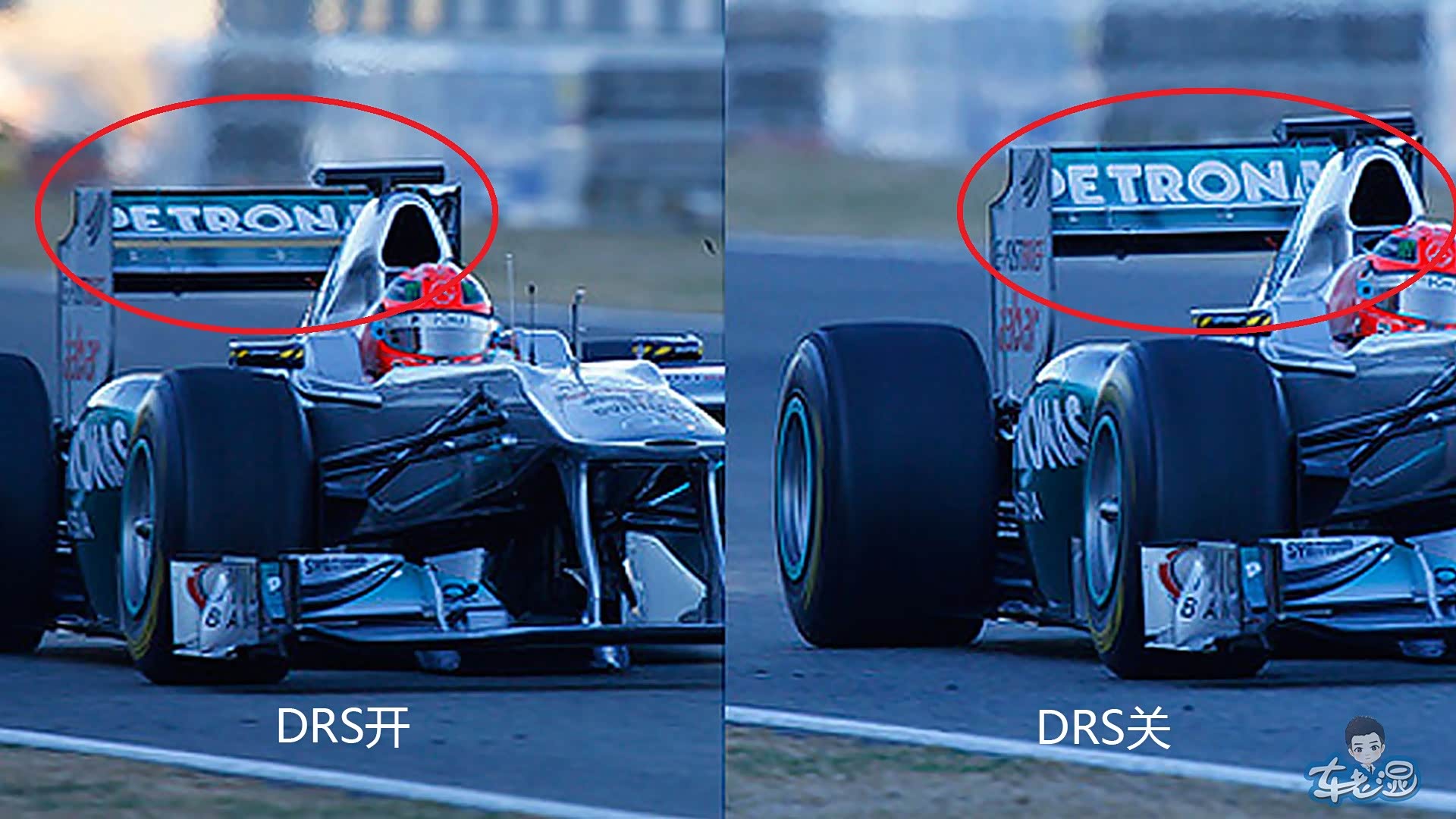 在2011年,为了增加比赛中超车的几率,增加比赛的观赏性,国际汽联将DRS系统引入F1赛车中。DRS相当于给尾翼的翼片加入了一套可调节角度的装置。在直道中打开DRS,尾翼翼片的攻角随之调小,空气阻力大幅降低,使赛车在直道上有了更高的尾速,从而增加了超车的几率。