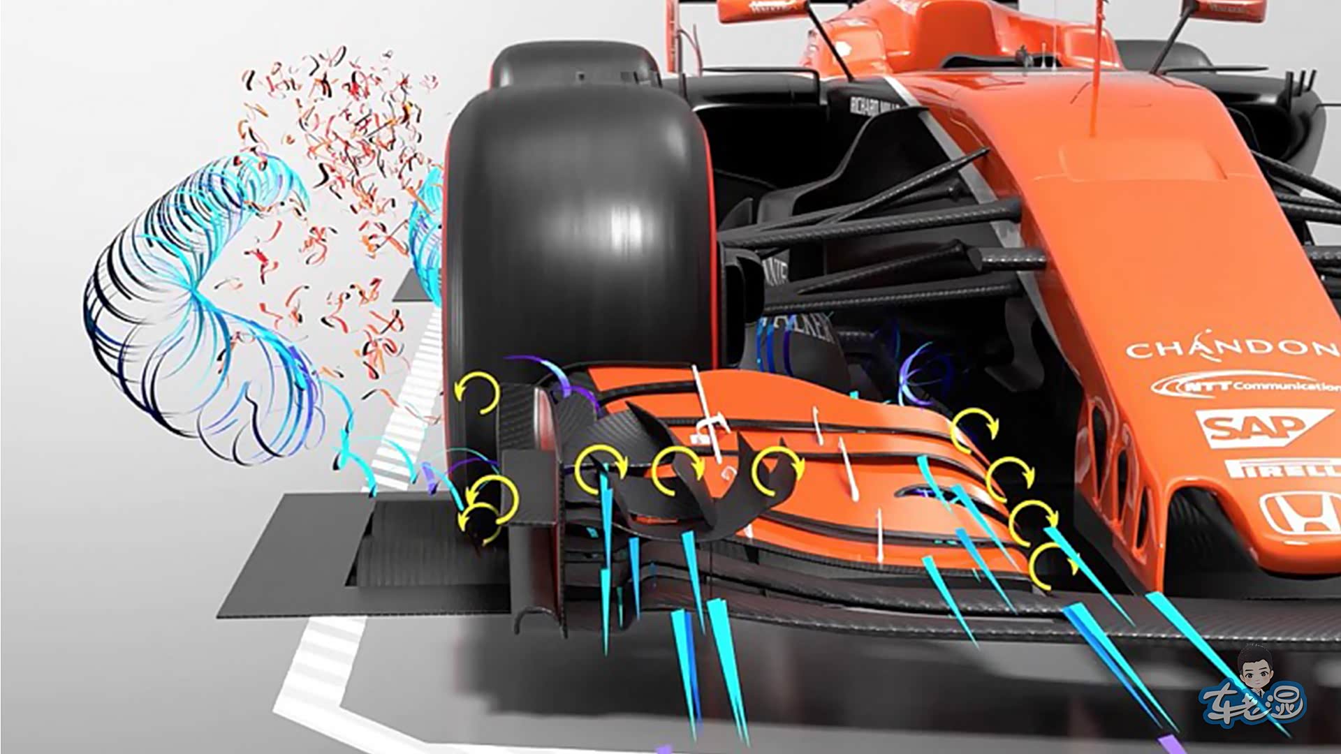 前翼除了能提供部分下压力以外,更重要的作用是整车气流管理的起点。前翼制造的湍流可控制前轮转动产生的乱流,尽可能地将他们向外推开,避免乱流进入车底影响扩散器的气动性能。即便是在转向过程中,前翼也能正常发挥作用。如果没有前翼,前轮形成的乱流会直接撞击后轮,这虽能够减小后轮的阻力,但对车底的气动来说却是灾难。
