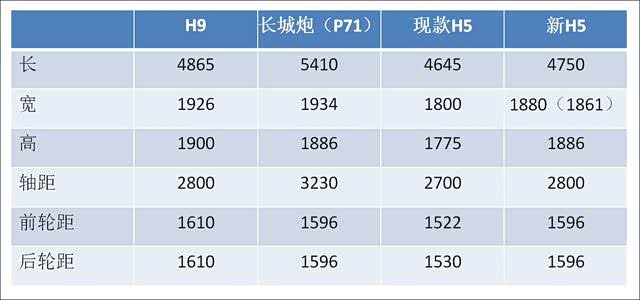 三年前,长城在沙漠大会上曾说过要开发介于H5及H9的车型,去年在永川工厂投产仪式上,长城掌门也透露在P71平台上开发纯越野车,就这些信息,我们不难推测新H5的一些参数特征。下表是H9、现款H5及炮也就是P71平台的尺寸对比,不难得出新H5的尺寸轮廓: