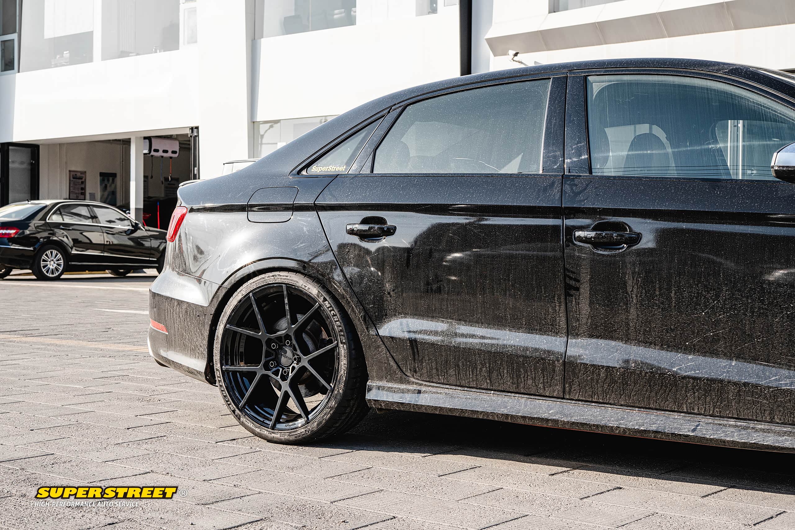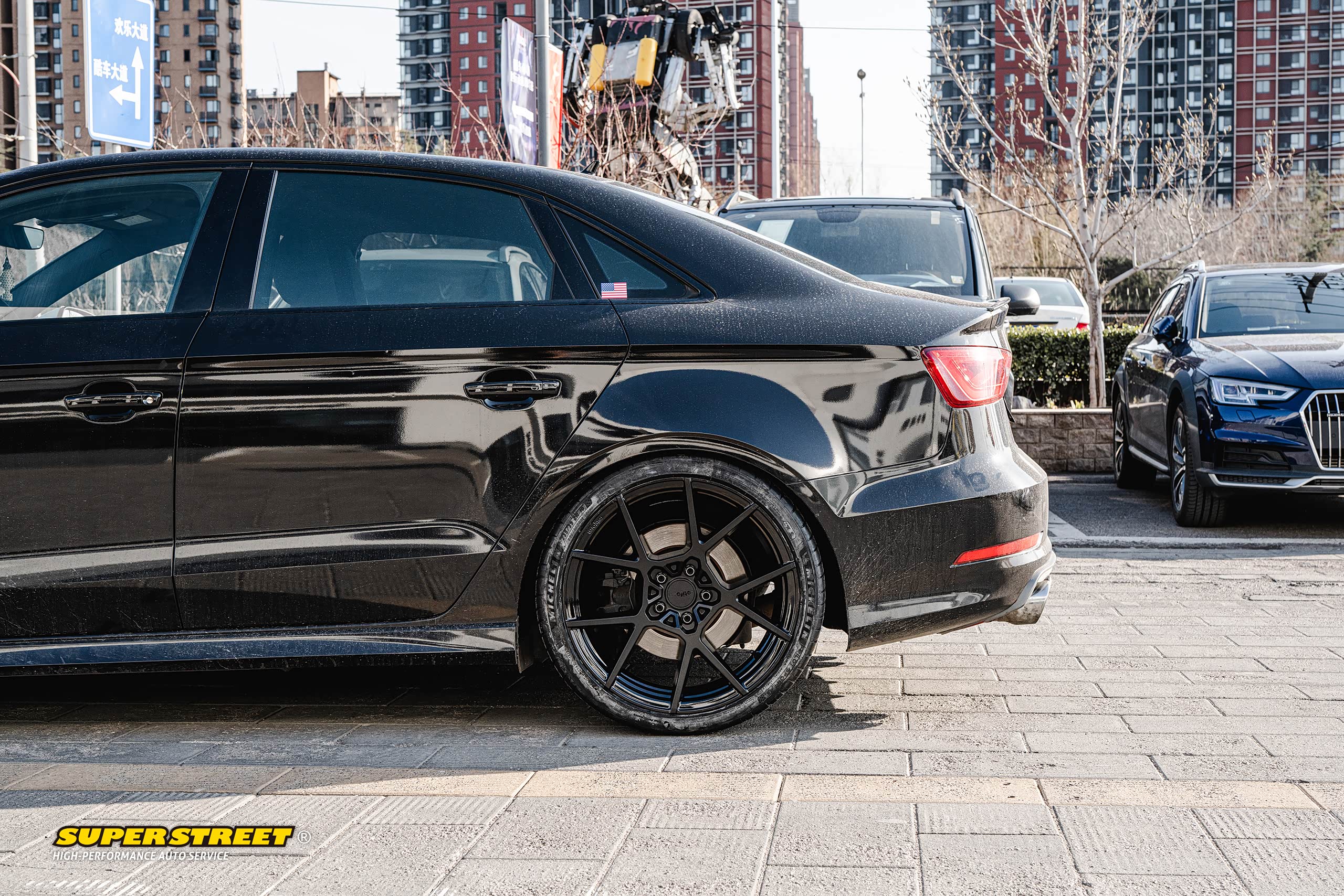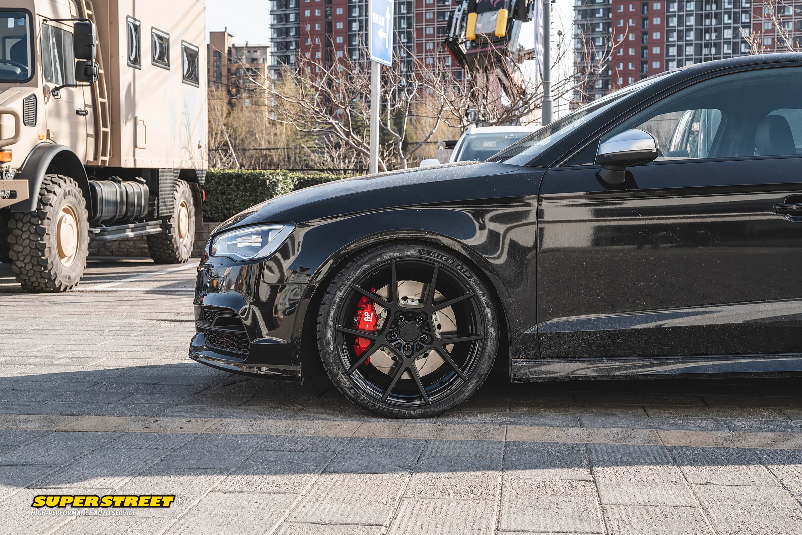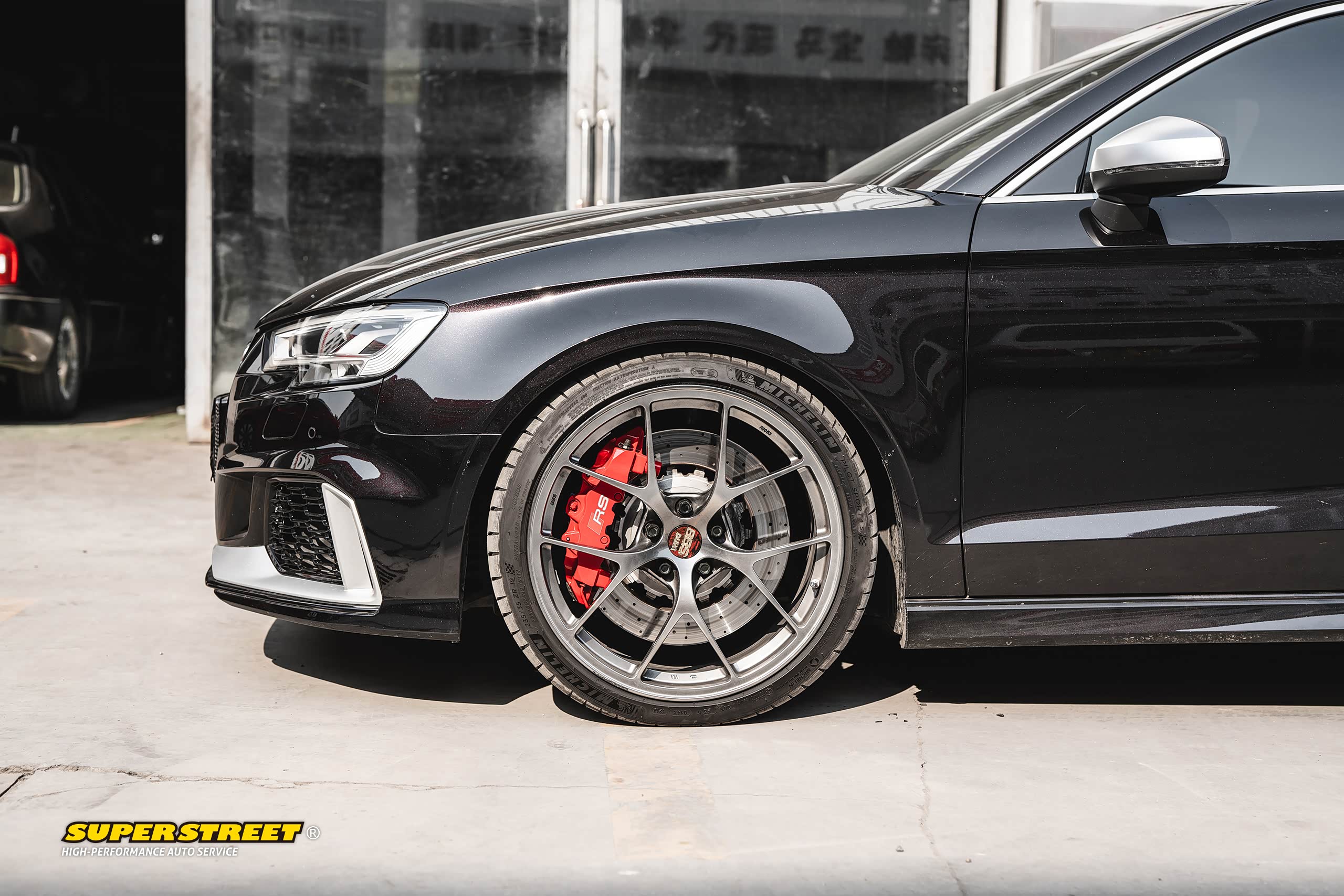 这个轮毂数据和奥迪RS3的一样(19X8.5J,ET35),使用了相同规格的轮胎(235/35R19),这台奥迪RS3改装了KW绞牙避震,也降低了车身,可以对比看下效果,