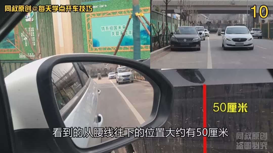 接下来我们再看一下更宽距离的看点:驾驶员自然向左看左侧车窗下沿对齐的位置,大约在腰线下方20厘米处,这个车间距是51厘米。