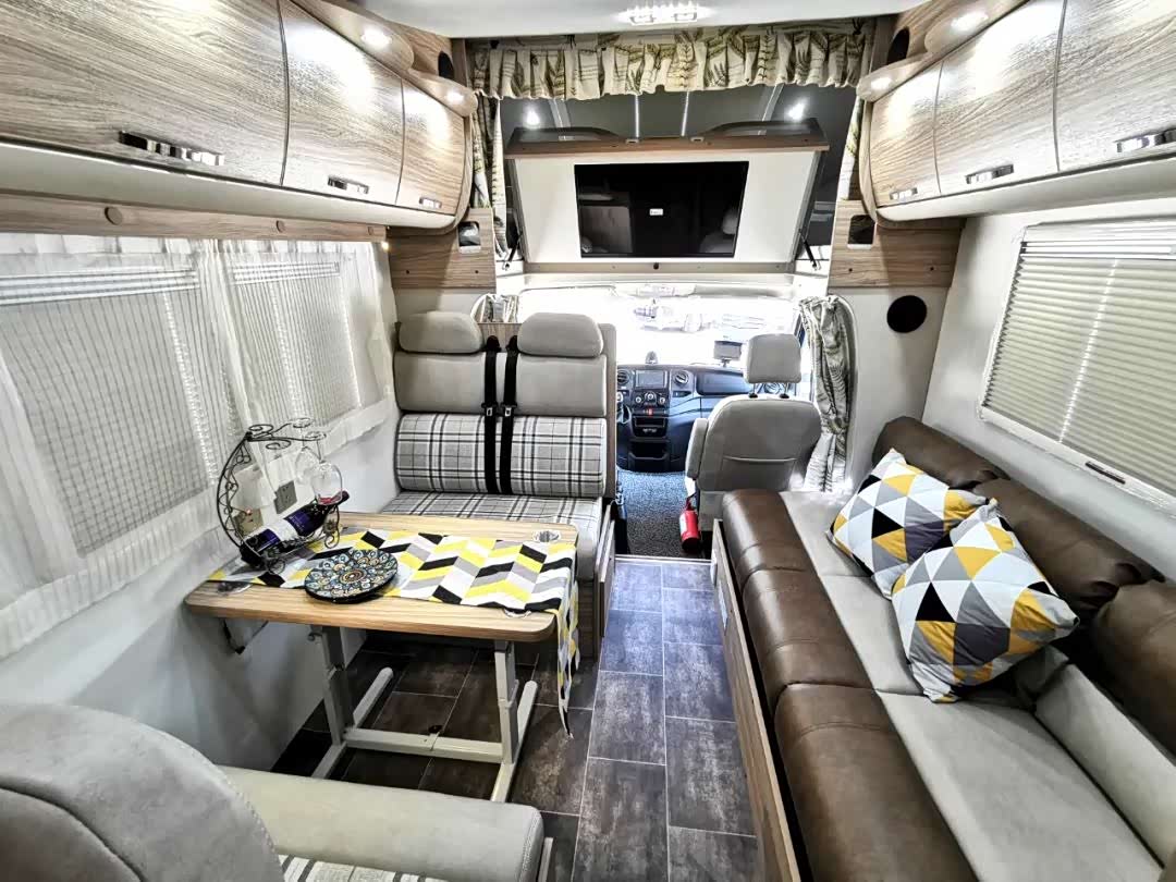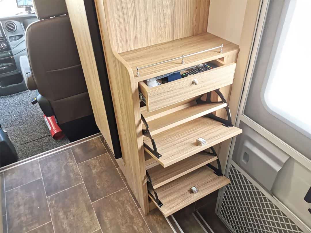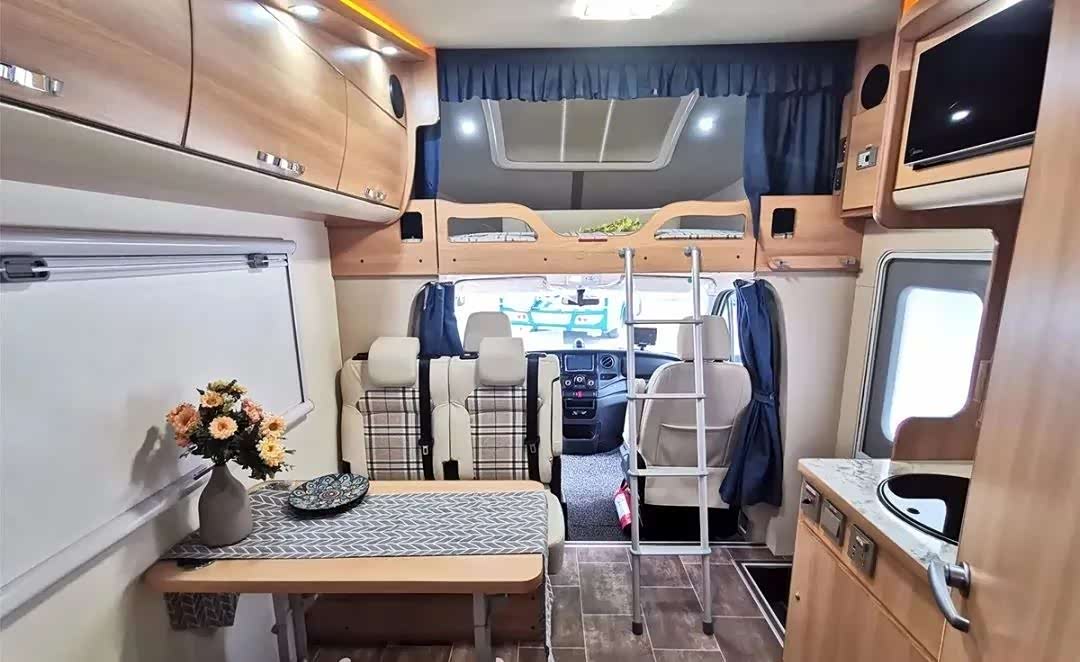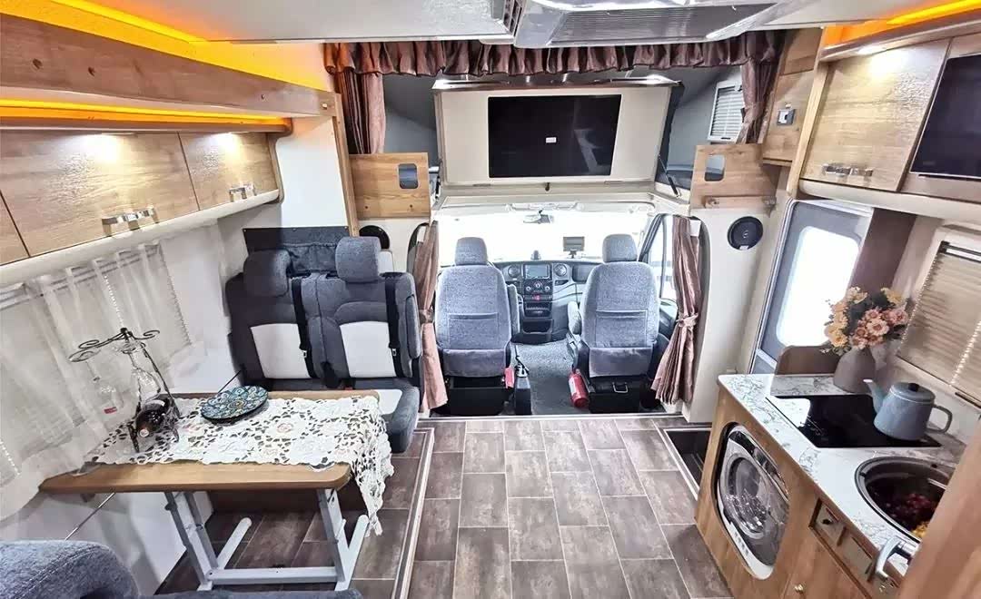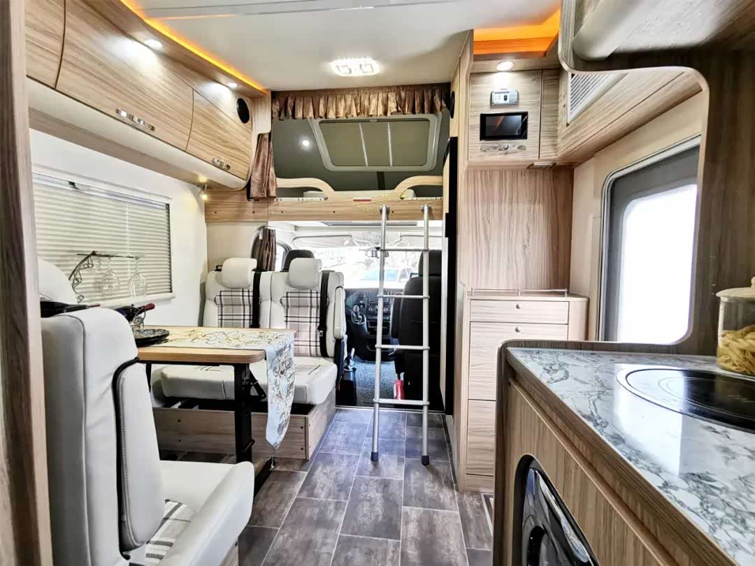 会客区采用对座式卡座沙发设计,搭配可升降餐桌,可临时拼成为临时床铺,沙发内侧墙壁上有外推窗,推窗上方有储物柜。驾驶室上方为额头双人床,床位尺寸达2200×1300(mm),两侧设有外推窗,额头床翻折起来是一台32寸电视。车尾部横置卧铺设计,拓展后可容两名成年人休息,尺寸为1350×1920(mm),此次升级,双卡座座椅可前后调节与靠背调节,更加人性化。