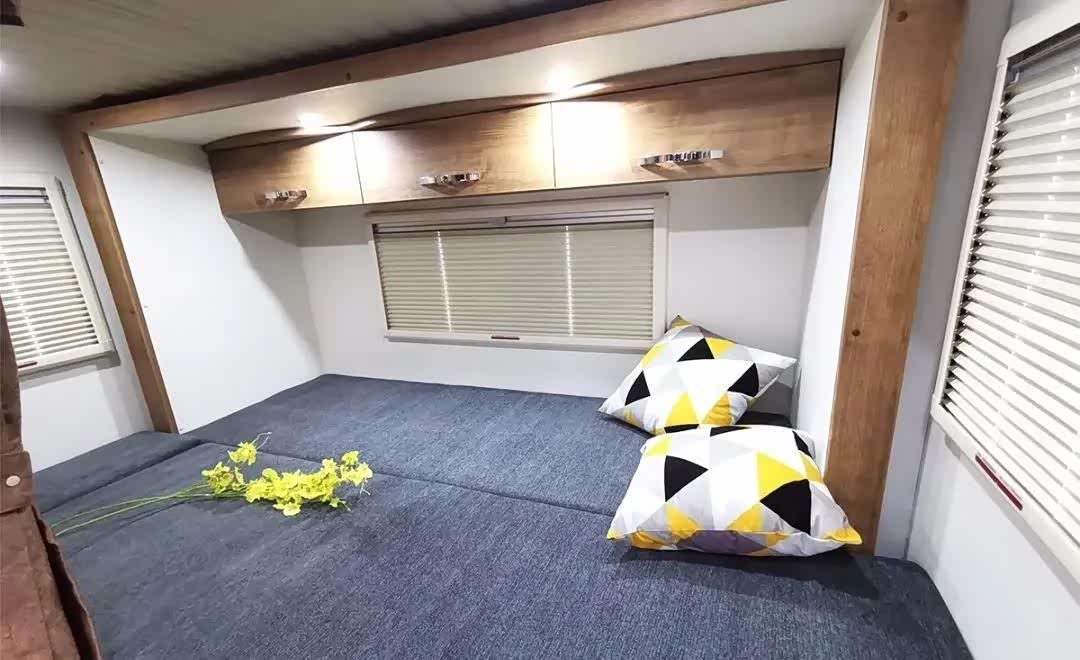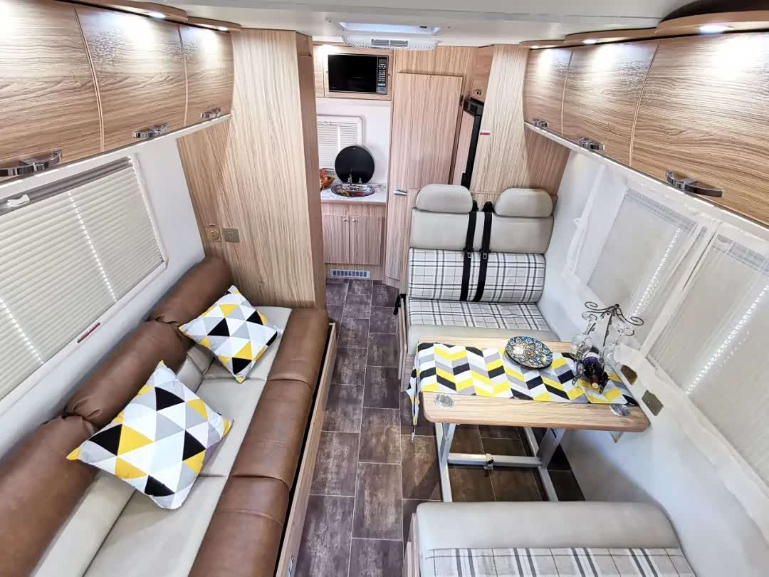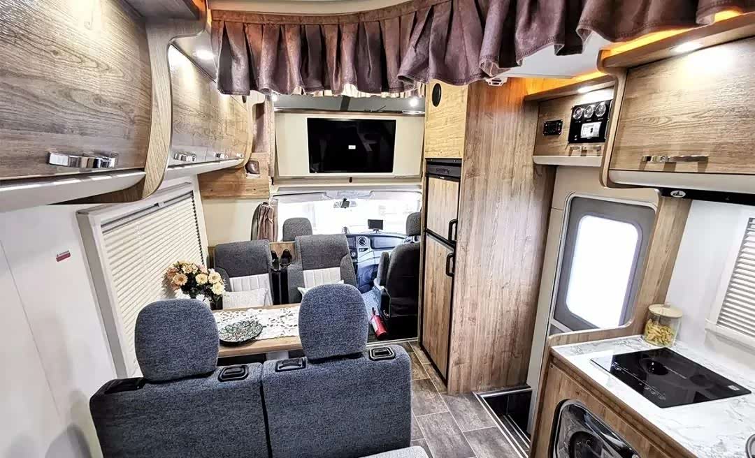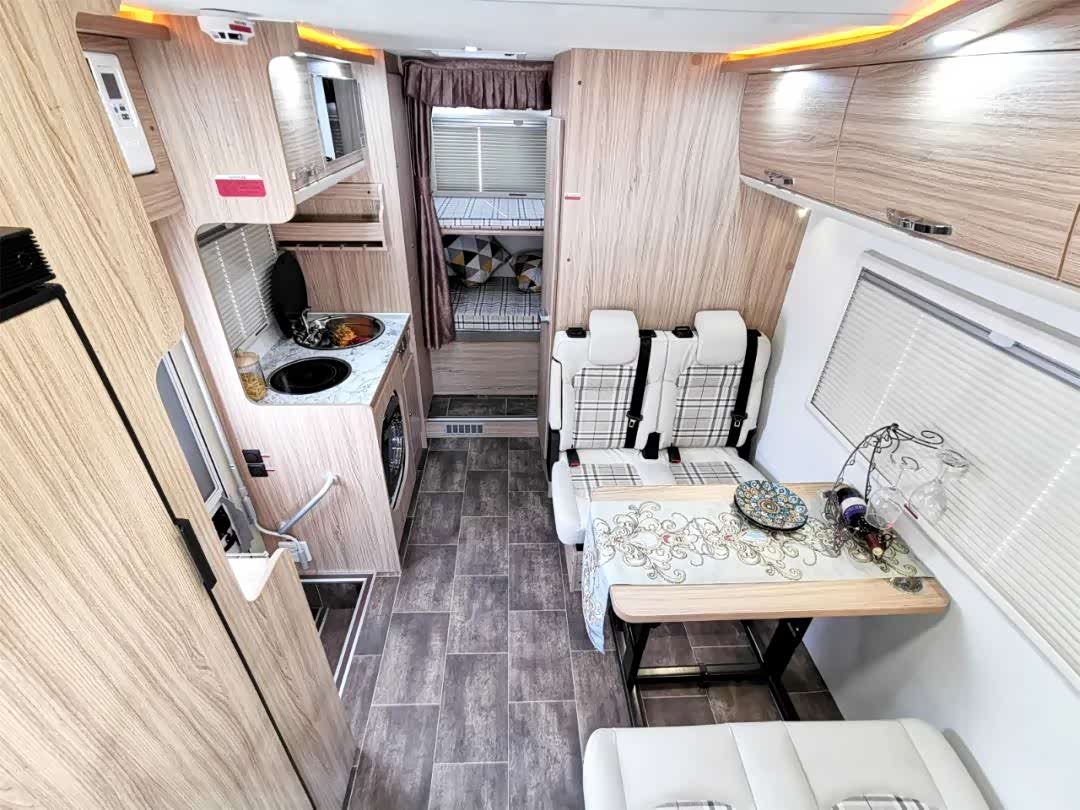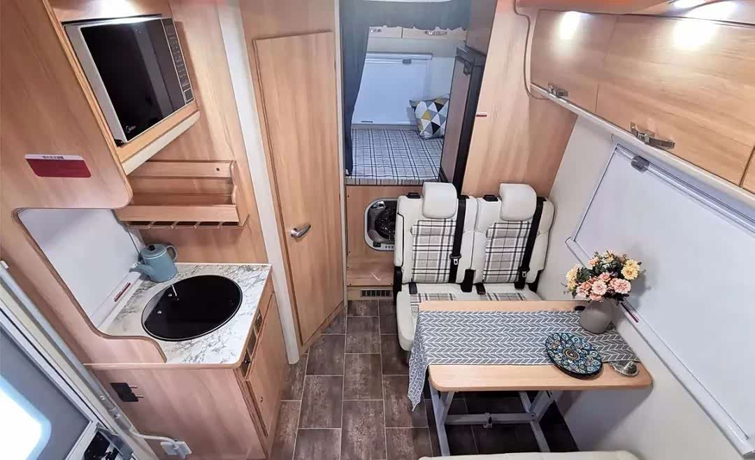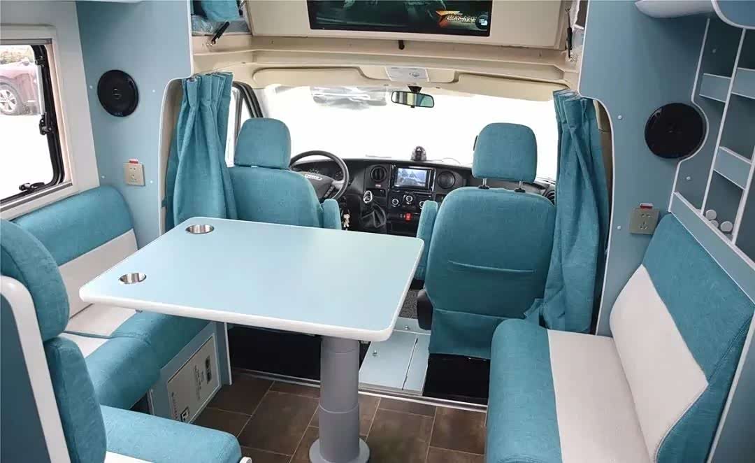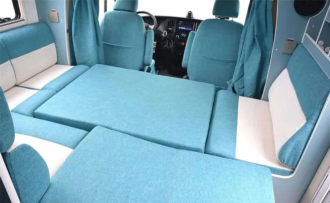 喜欢内部大空间的用户,这款车的布局可能适合你。后开门设计,让车厢内的空间得以全部利用,双人对坐卡座+对面长条沙发,过道空间宽敞,后方是卫生间和厨房。长条沙发可变成一张1000×1840(mm)的床位,可满足单人休息。额头大床尺寸1300×2200(mm),卡座转换床尺寸900×1800(mm),这样的基础布局可满足一家3-4口人为最佳。