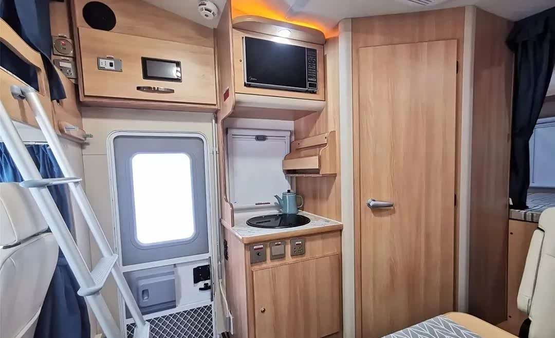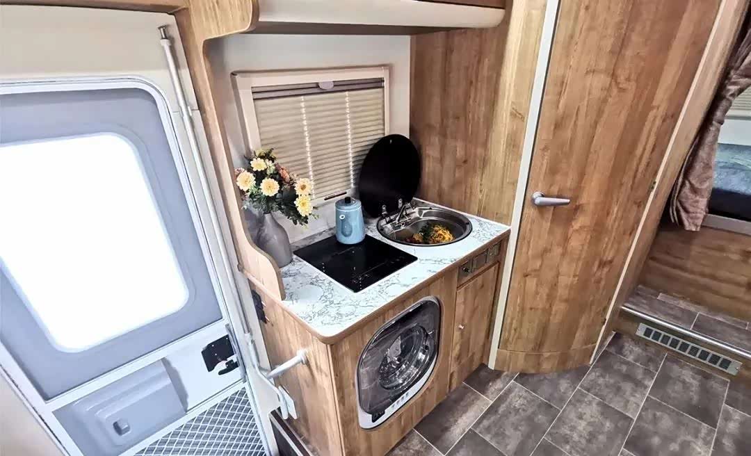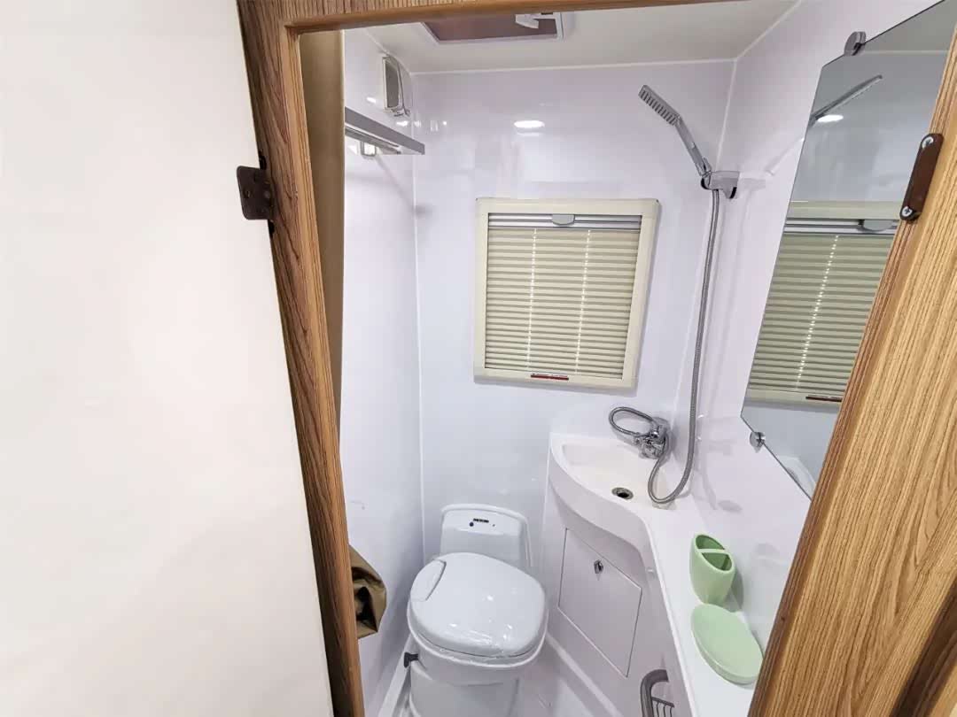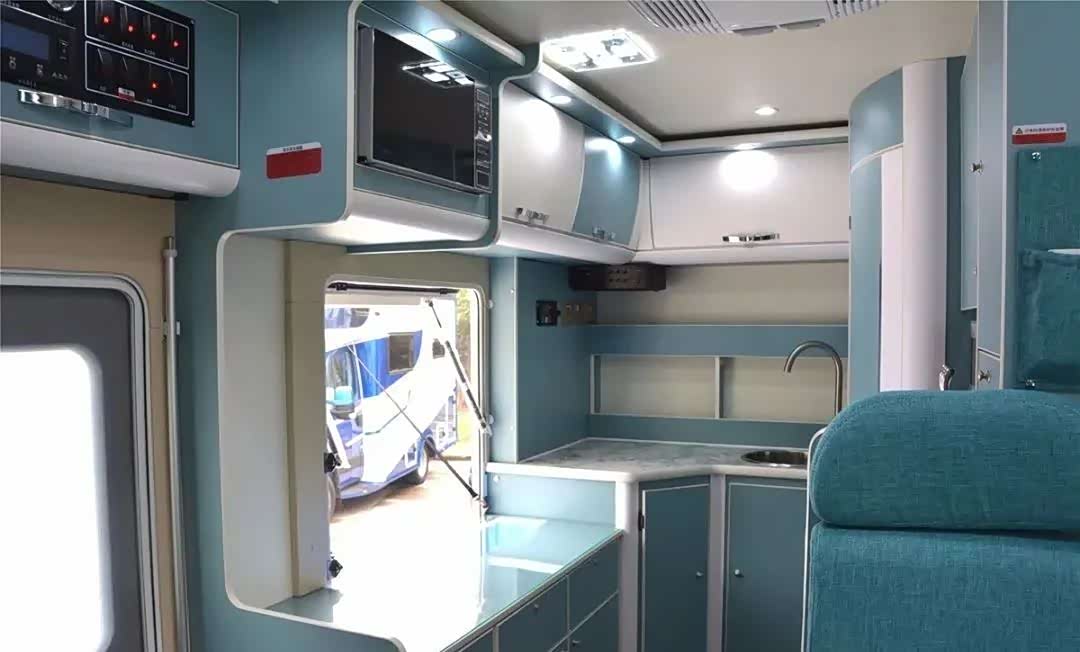 厨房区位于卡座沙发对面,配备带盖式水槽,电磁炉。卫生间采用干湿一体式设计,内部配备赛特福德可旋转盒式座便器、洗手池、梳妆镜、换气扇,淋浴器等。水路系统方面,净水箱容积为150升、灰水箱容积为80升。生活设备方面,标配燃油暖风热水供应系统,驻车空调系统H2400,小米盒子+车载WIFI,车载DVD,导航一体机,188升冰箱(高配可选配216升冰箱)。