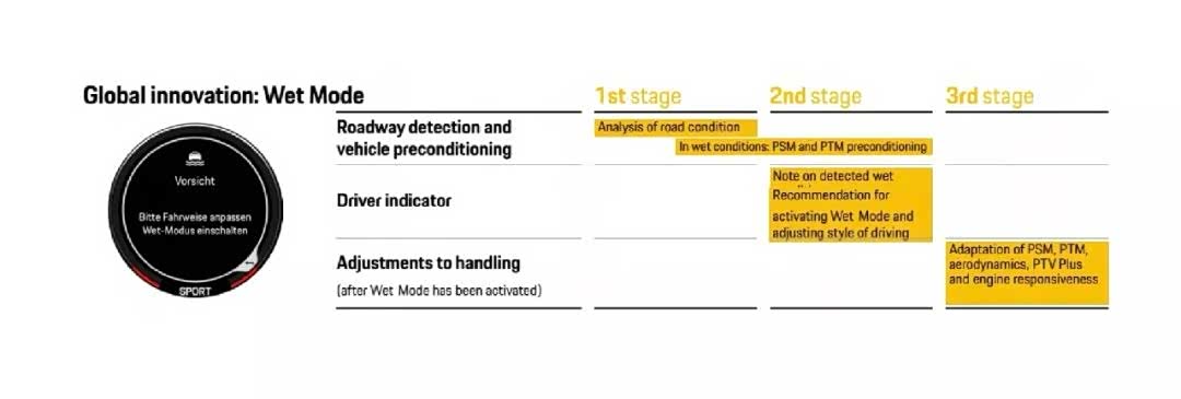 监测属于第一阶段,到了第二阶段就是生成解决方案并建议开启Wet模式,若切到了Wet模式就进入第三阶段,全车系统会协同工作: