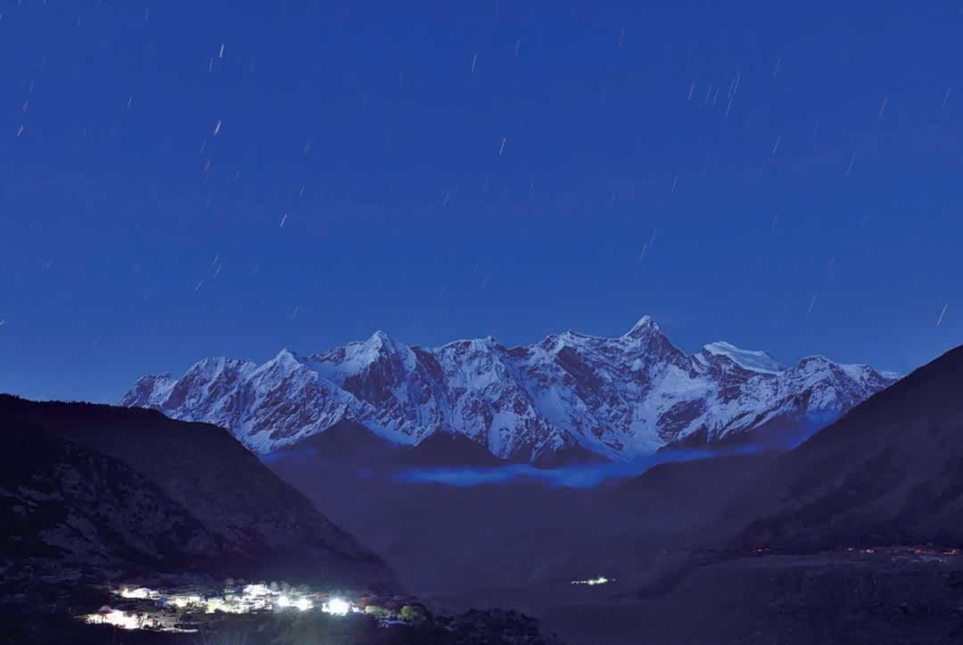 下午我们去踩点,这是每一次拍银河需要提前做的功课。从索松村向前北走几公里,到达达林村,南迦巴瓦峰的西北面,被我们确定为能拍下银河与南迦巴瓦峰同框的地方。剩下的就是等待,等待日沉月升,斗转星移。4月的银河升起的时间比较早,夜幕降临,南迦巴瓦脚下的村庄也亮起些许灯火,夜深灯火尽灭,却正是赏星之时。干净的天空,银河明显,南迦巴瓦大概是一座是我见一次就迷恋的雪山,一条是我永远看不够的银河,一朵开在我心里的桃花,在这个春天,我如愿以偿。