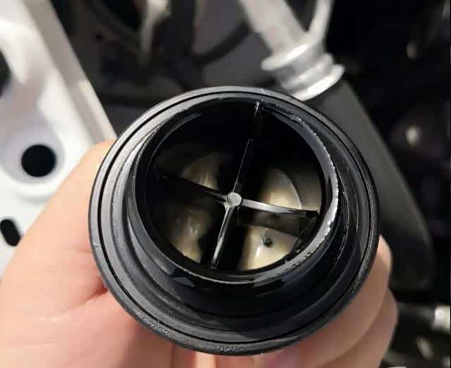 另一方面,出现在机油盖上的机油乳化现象,也是因为PVC系统将曲轴箱窜气中的高温水蒸气和可燃气体,在经过油水分离器之后的自然凝结。相较于可燃混合气,水蒸气是不希望进入到燃烧室的。所以,当高温的水蒸气在气门式罩盖的位置被分离出来之后,自然而然的就会在温度相对较低的机油加注口盖位置凝结,和残留在这一区域的机油混合。同样的,只要发动机温度上升,水汽就会自然蒸发。
