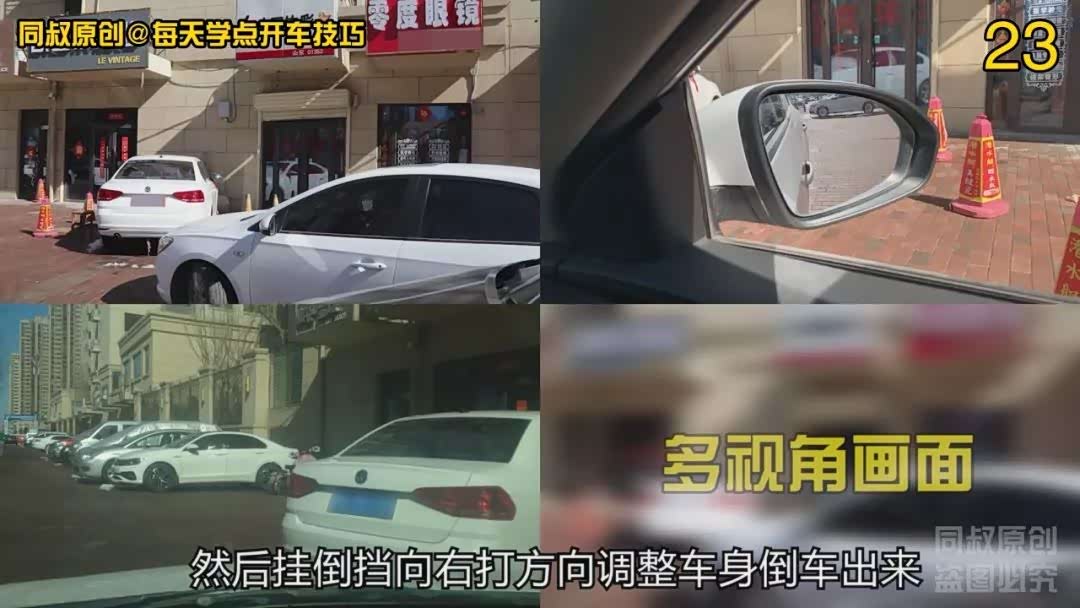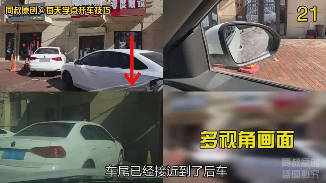 再看看倒车出来的时候怎么看。正式倒车出位前,先把车身调整到尽量靠右的状态,车头向左摆斜,这样在倒车向右拐的时候,车头向左画弧线的半径尽量缩小,距离左侧车辆距离就会尽量扩大。