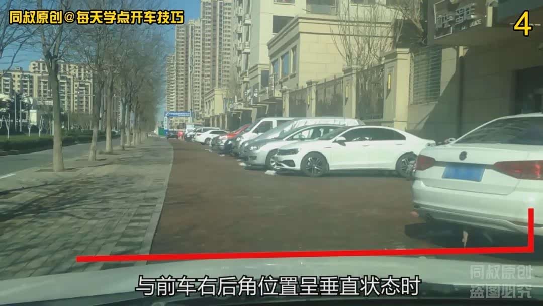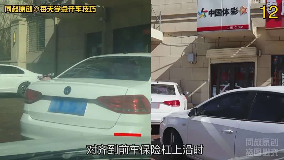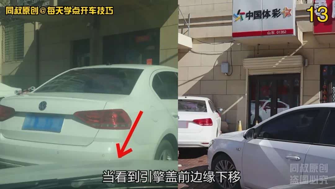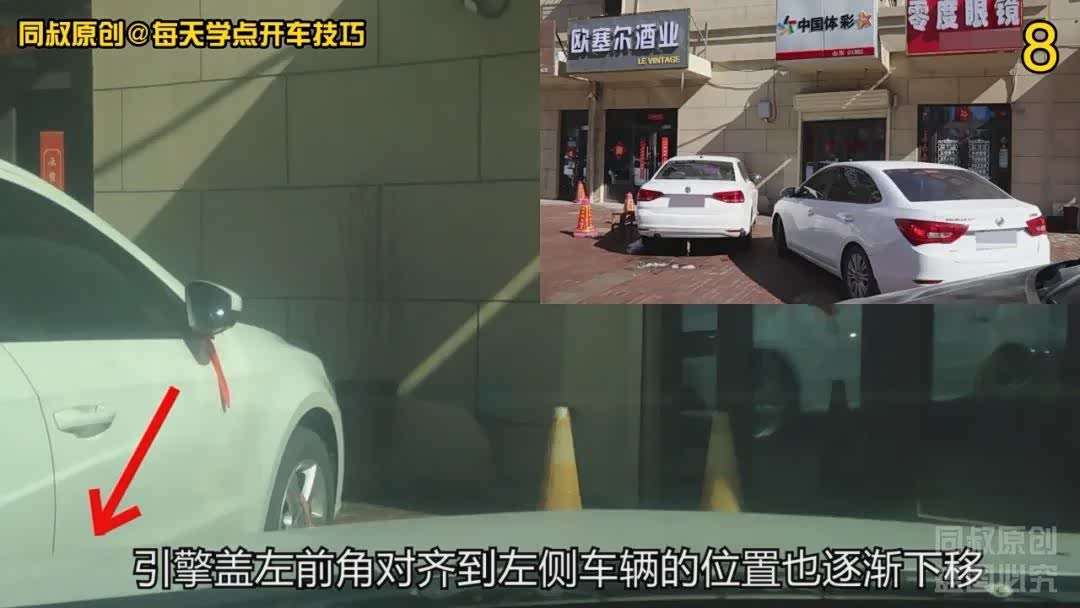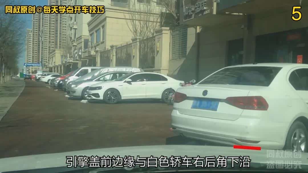 再挂前进挡向右打满方向,看到引擎盖前边沿对齐的位置逐渐上移到前车右后角腰线位置稍微靠上一点点的时候,对齐到我车左前角这是最近距离了,