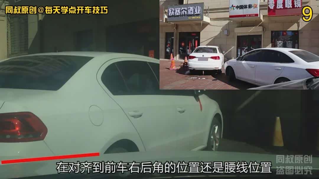 挂倒挡向左打方向稍微倒一点点,当看到引擎盖前边缘下移对齐到前车保险杠中间时,向右回方向停车。