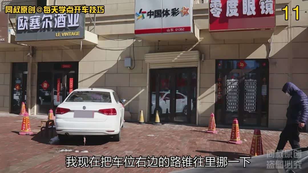 我现在把车位右边的路锥往里挪一下,把车位收窄,然后再演示一次看看还能不能进得去出得来,观察极限距离到什么程度以及看点的变化。