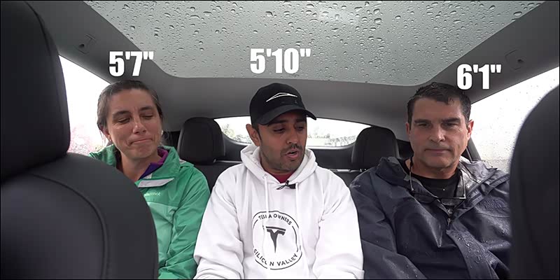 Model Y 的后座宽度其实和 Model 3 相同(129.54 公分),以这影片三位平均身高 177.8 公分的乘客为例,这座位宽度算是相当不错,毕竟一般亚洲人很难会遇到同时有三位如此高大的乘客吧。