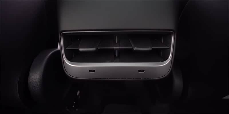 在 Model Y 的后座,除配备了空调出风口和 2 组 USB 和Type-C 充电插口。