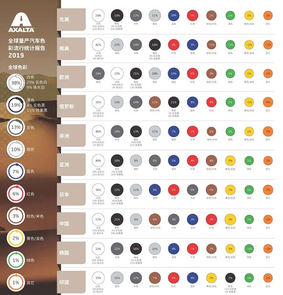 根据艾仕得发布的《2019全球量产汽车色彩流行统计报告》,全球主要市场的汽车销量中,白色汽车以占比38%的绝对优势,成为全球消费者最喜欢的汽车颜色。