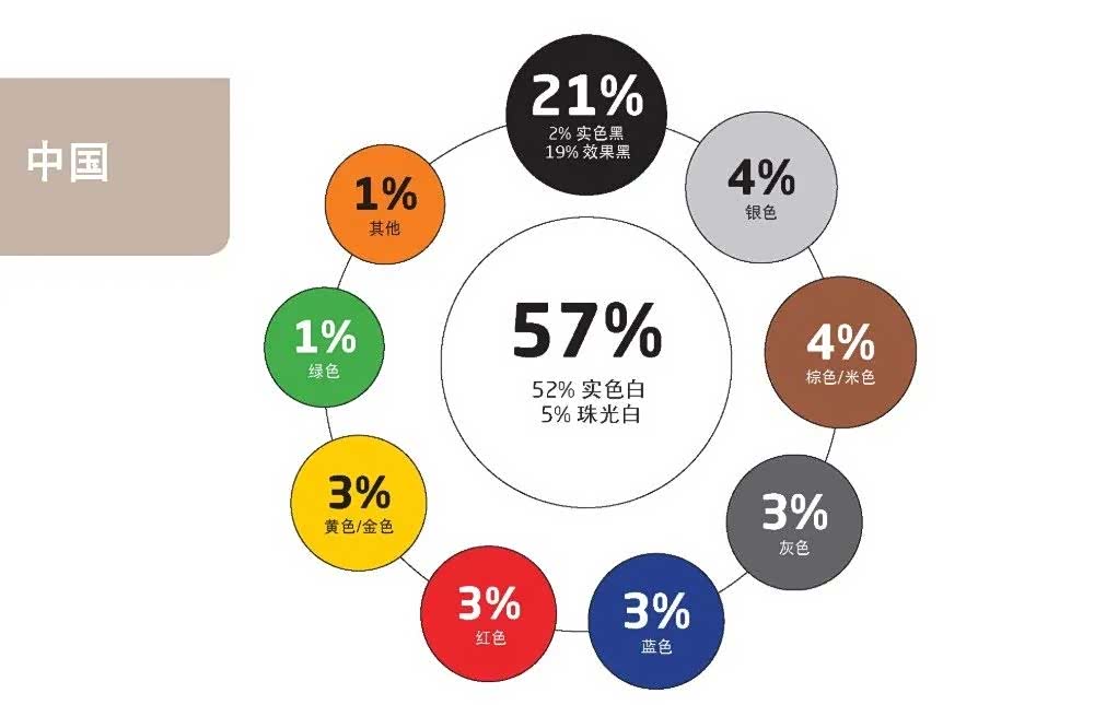 而对于白色汽车的偏爱,国内似乎更为明显:在中国高达57%的车主购车时选择了白色,甚至不少4S店还出现了“选白色车要加价”的现象。