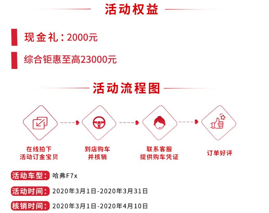 举个例子,在哈弗智家APP注册为经纪人,并为身边朋友推荐购车成功后,经纪人排行榜中的前500名,可获得300元车品优惠券;进入前20名的经纪人,可获得价值1000/600/300元的战疫健康礼包。而且,在各大平台长城汽车官方旗舰店举办的“折上折”活动中,交纳1元订金,便可获得F7x的2000元购车优惠,综合优惠最高至2.3万元。同时,在一口价服务中还可享受首付5%,36期/48期的低首付低月供回租金融方案,可谓是操作简单收益多。