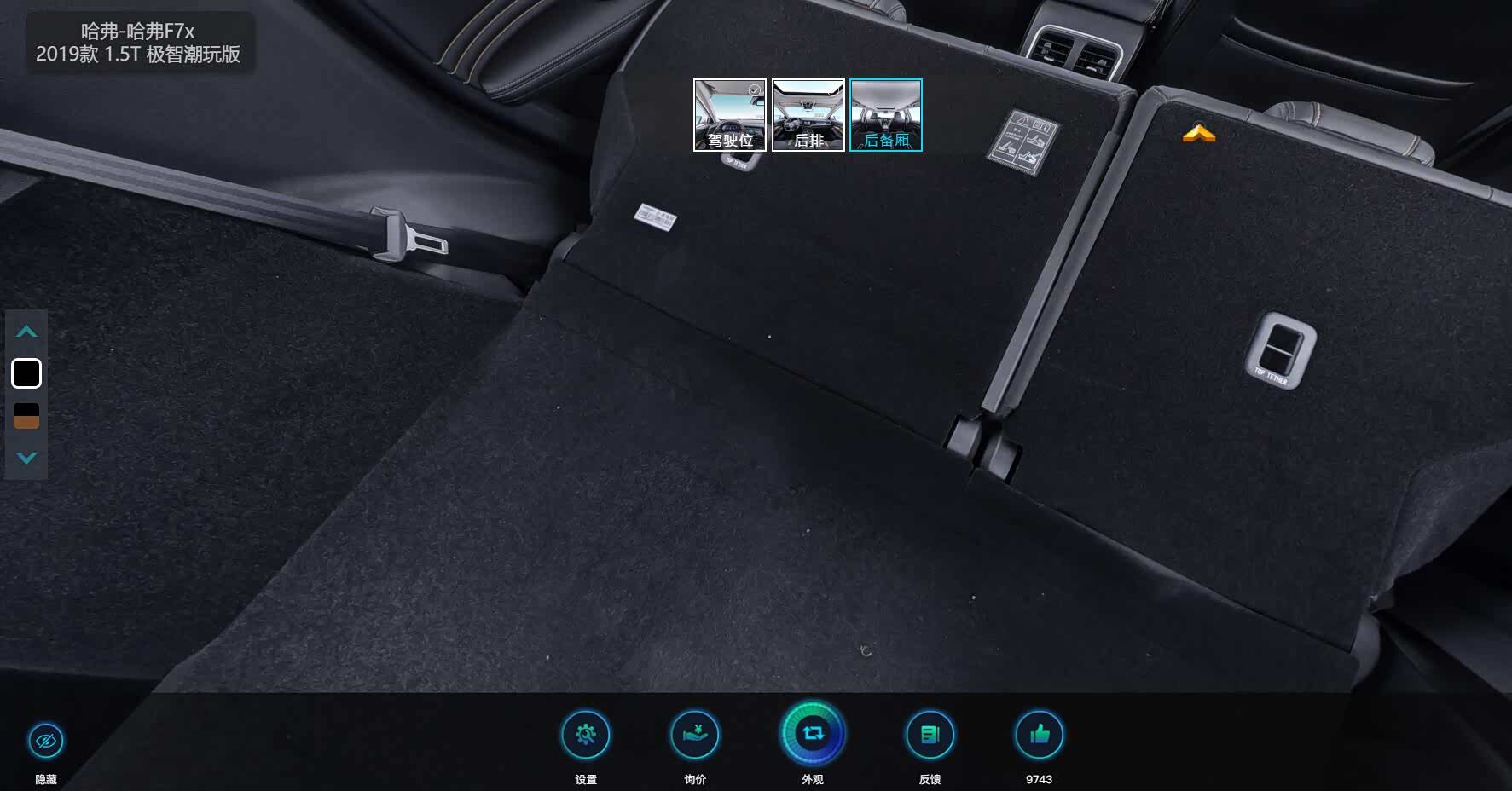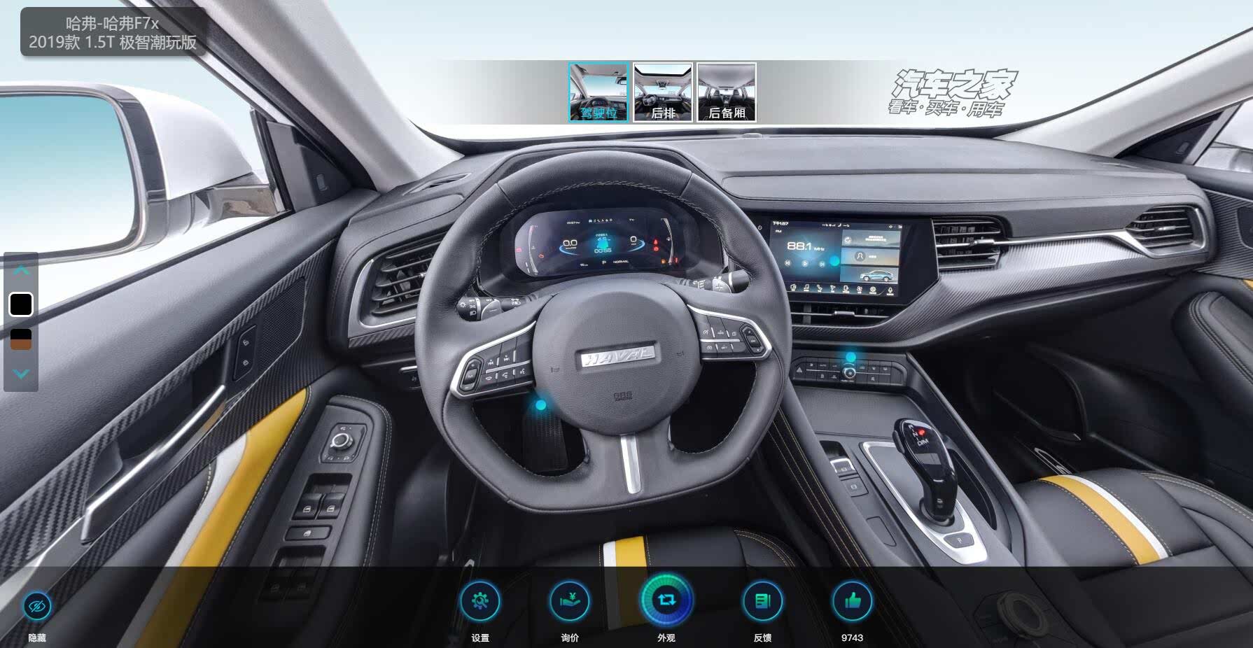 当手指滑动到车辆侧后方时,便可看到F7x溜背式的车顶设计,这也是这款车型在外观上最大的亮点。溜背式车顶从B柱开始向下倾斜,并与车尾巧妙地结合在一起,使得F7x拥有非常动感的车身线条。同时车尾设计也非常饱满,层级感很强,给人一种厚实的感觉。此外,若想查看车辆颜色,点击颜色图标就可以为该车换上月影灰、旭日红、深海蓝等五种不同的车身颜色。