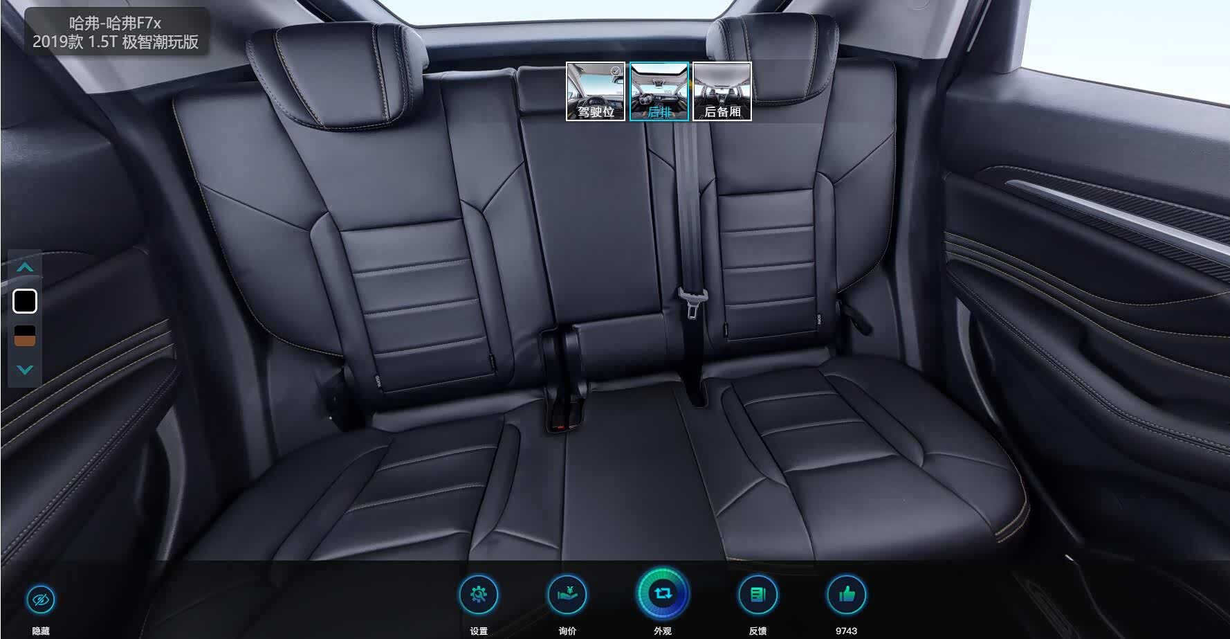 点击进入车内,F7x的内饰一目了然,该车使用了以驾驶者为中心的内饰布局,并拥有黑色、黑/棕和黑/红三种富有活力的内饰配色,座椅和车门线条的颜色也会随之改变。来到后排,F7x为后排乘客配备了独立的头枕和中央扶手箱。