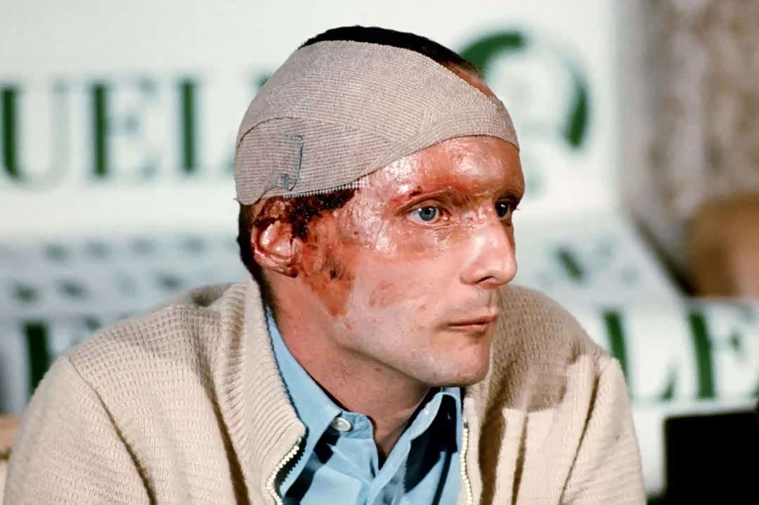 1976年F1德国站在纽博格林赛道举行,比赛当天倾盆大雨不期而至。正赛第2圈,劳达的赛车后悬架发生断裂,撞到护墙后弹回赛道,又被一辆福特赛车撞上,劳达的赛车瞬间燃气熊熊大火。经过治疗,劳达还未完全恢复,大火给他造成了头部严重烧伤,并留下了大片伤疤,同时损失了部分听力。令人佩服的是他不仅生还,且在6周之后就返回赛场,在蒙扎站拿下第4名,他的回归被赛车界誉为是最勇敢的典范之一。