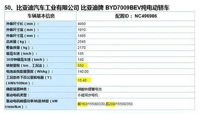 汉EV四驱版的NEDC综合续航里程为550km,两驱版车型为605km。在目录中,汉EV四驱版的百公里耗电量为15.4度电,一共能跑550公里,按照这样换算的话,汉EV的四驱版,电池组可用容量约84.7kWh。