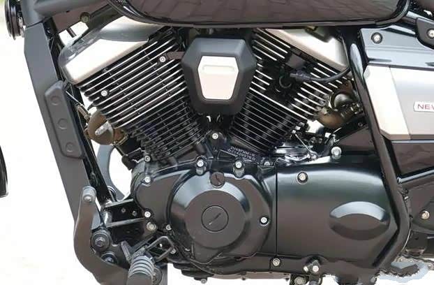 从车身侧面来看,就能感觉到这款车身设计非常的圆润,包括复古巡航车,比较经典的水滴形油箱,整体看起来气质十足。而车身配色也是采用比较经典的复古黑。另外发动机的造型也是采用巡航车比较常见的V缸设计,表面装有银色的装饰,十分吸引眼球。