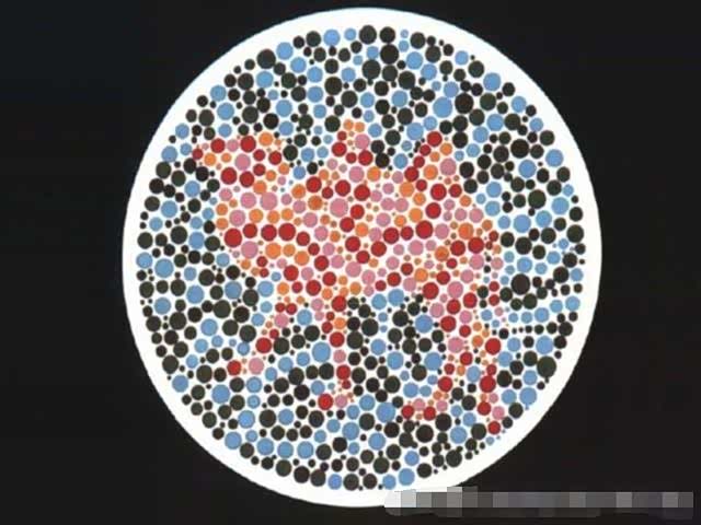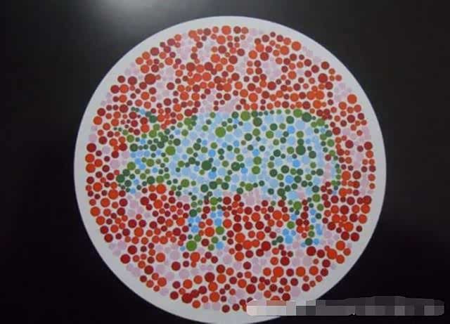 这张也是,色弱的人第一眼看到的是只匍匐的兔子,而色感正常的则会首先发现一头蓝绿圆点构成的牛。话说也有不少人质疑车管所的这种色盲检测,一是认为不科学,二是觉得糊里花俏的,不是色盲也被搞成色盲了,直接红黄绿灯什么的开测不好吗?