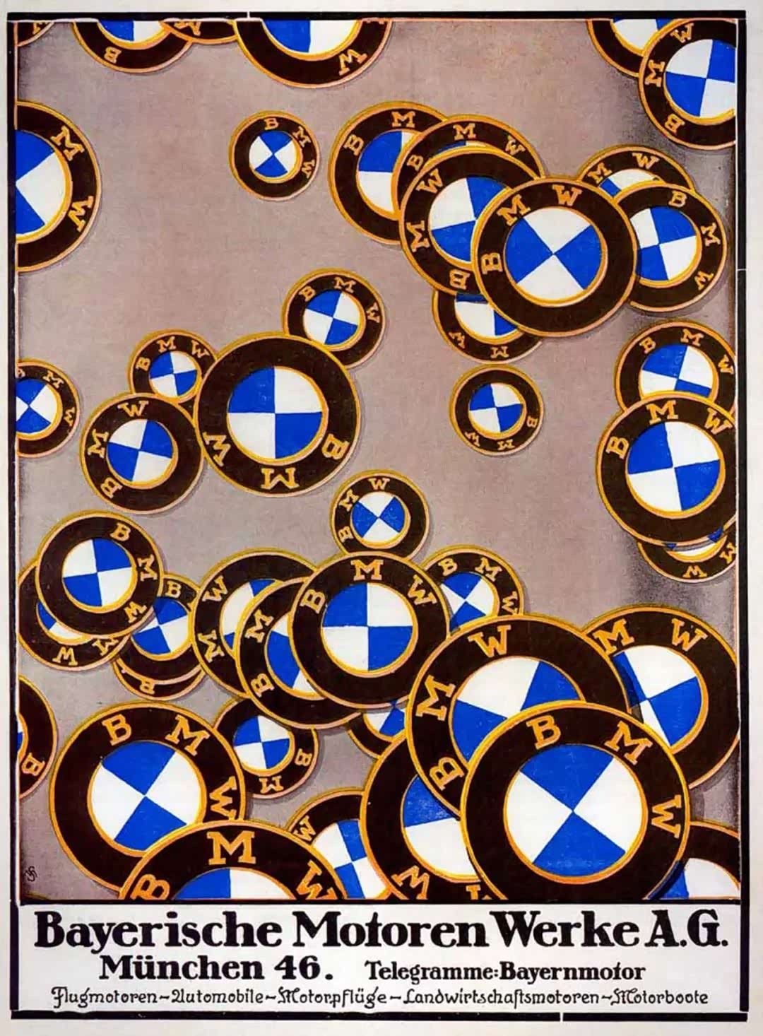1917年商业品牌的认知度在欧洲并没有完全达到顶峰,所以修改过的徽标很少得到宣传。直到1918年,它才首次出现在《巴伐利亚飞机发动机手册》的封面上。直到1923年,这枚圆形徽章才出现在汽车上。