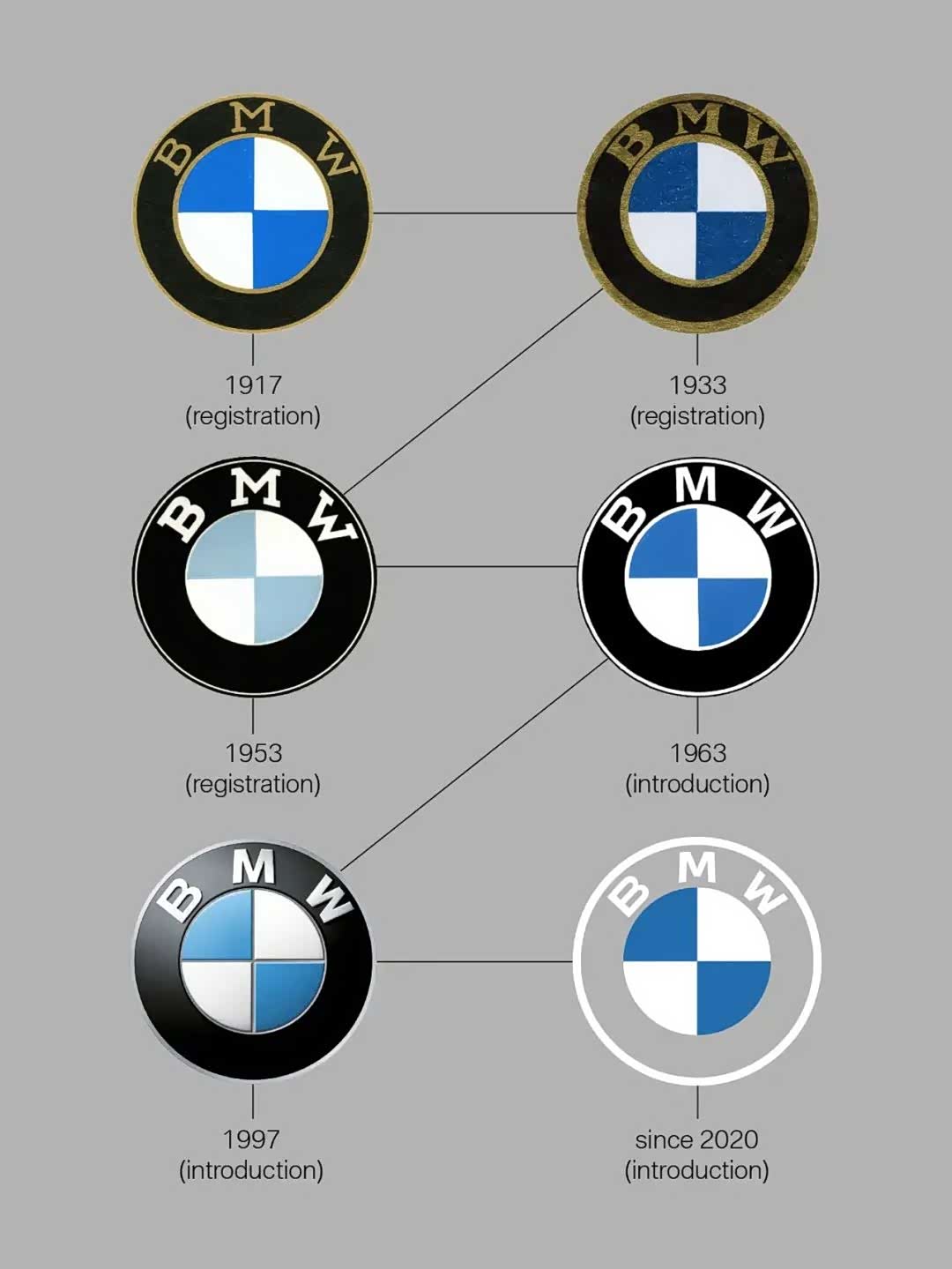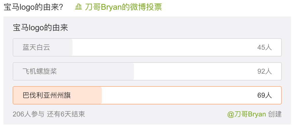 在准备写这篇文章之前,我在微博上做了一个小调查,结果不出所料。从1917年创厂至今,总共只发布过6次LOGO。但多年以来,不少人都以为LOGO的由来是源自过往生产飞机发动机起家的历史,LOGO以白色的飞机螺旋桨,搭配蓝色晴朗的天空,但其实根本不是如此。