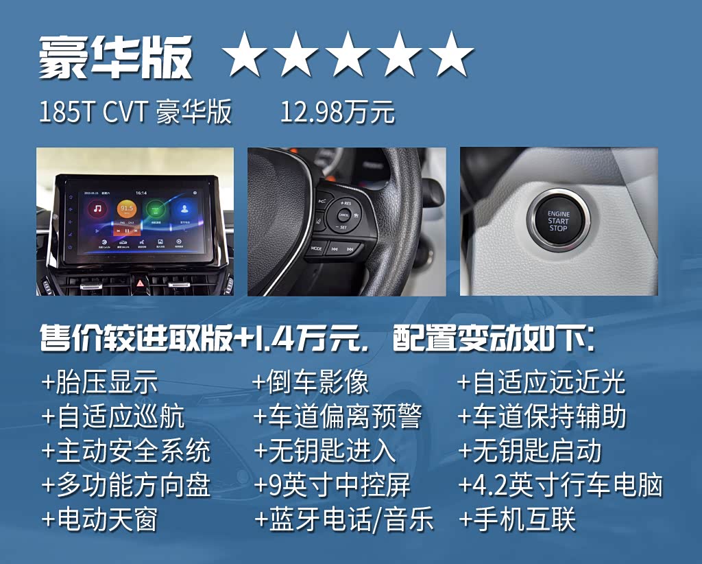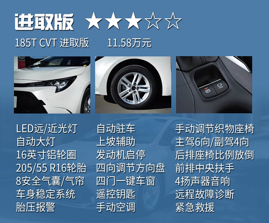 以合资品牌的标准看,全新雷凌基础配置较为丰富,标配8安全气囊、胎压报警、车身稳定系统、LED远近光灯和自动大灯,在这一级别颇为难得。除运动版外,其余4款车型均配备16英寸铝合金轮圈,尽可能减小了不同配置的外观差异。自动驻车、电子手刹等实用配置也没有缺席,日常驾驶便利性有一定保证。