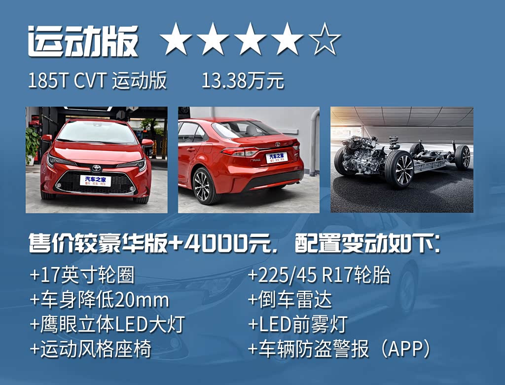 值得一提的是,全新雷凌还推出了运动版,为追求个性的朋友提供了更多选择。同级竞品的运动版车型大多只是换上了运动外观套件,不过雷凌运动版针对底盘进行了特殊调校,车身高度降低20mm,悬挂几何标定也有所不同,带来更为扎实、进取的驾控体验。