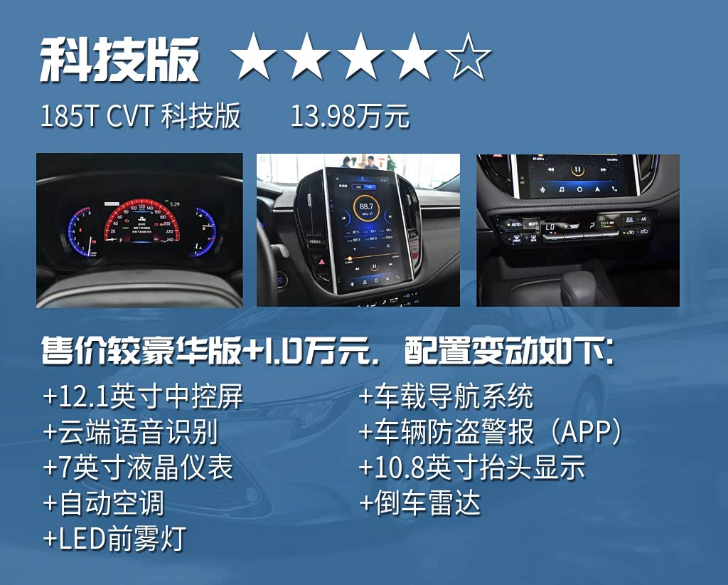 鉴于运动版的特殊性,科技版更适合与豪华版进行比较。科技版最大的变化是增加了三屏联动智能显示系统,多媒体系统互联功能更加丰富,并配备了同级罕见的HUD抬头显示。科技版还加入了自动空调和倒车雷达,实用性有一定提升。1万元的差价固然要仔细权衡,但也算得上合理,推荐给注重车机体验的朋友们。