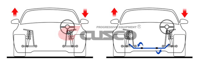 如图所示,当一侧悬架被压缩时,防倾杆通过自身的弹力来限制另一侧悬架的拉伸,这样就不会使得车身侧倾过大。而当两侧悬架同时被压缩或者拉伸,也就是加速、刹车、过起伏时,防倾杆就不起作用。